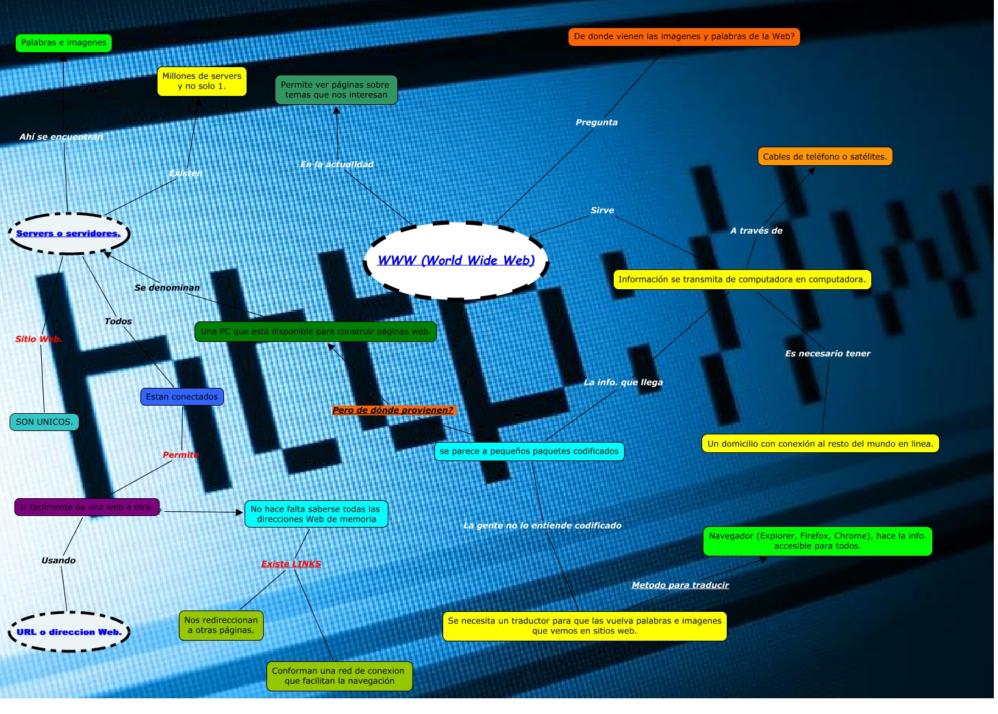 Este Cmap, tiene información relacionada con: Martín Gallelli - WWW, WWW (World Wide Web) En la actualidad Permite ver páginas sobre temas que nos interesan, Ir facilmente de una web a otra. ???? No hace falta saberse todas las direcciones Web de memoria, Servers o servidores. Sitio Web. SON UNICOS., No hace falta saberse todas las direcciones Web de memoria Existe LINKS Conforman una red de conexion que facilitan la navegación, Servers o servidores. Todos Estan conectados, Servers o servidores. Existen Millones de servers y no solo 1., WWW (World Wide Web) Pregunta De donde vienen las imagenes y palabras de la Web?, Ir facilmente de una web a otra. Usando URL o direccion Web., Una PC que está disponible para construir páginas web. Se denominan Servers o servidores., No hace falta saberse todas las direcciones Web de memoria Existe LINKS Nos redireccionan a otras páginas., WWW (World Wide Web) Sirve Información se transmita de computadora en computadora., se parece a pequeños paquetes codificados Pero de dónde provienen? Una PC que está disponible para construir páginas web., se parece a pequeños paquetes codificados La gente no lo entiende codificado Se necesita un traductor para que las vuelva palabras e imagenes que vemos en sitios web., Información se transmita de computadora en computadora. La info. que llega se parece a pequeños paquetes codificados, Estan conectados Permite Ir facilmente de una web a otra., Información se transmita de computadora en computadora. A través de Cables de teléfono o satélites., Servers o servidores. Ahí se encuentran Palabras e imagenes, Información se transmita de computadora en computadora. Es necesario tener Un domicilio con conexión al resto del mundo en linea., Se necesita un traductor para que las vuelva palabras e imagenes que vemos en sitios web. Metodo para traducir Navegador (Explorer, Firefox, Chrome), hace la info. accesible para todos.