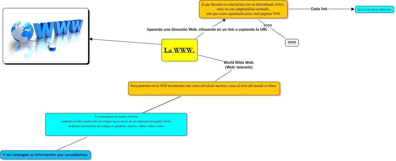 Este Cmap, tiene información relacionada con: Valentin Hohl WWW, lo que hacemos es conectarnos con un determinado server, estas no son computadoras normales, sino que estan capasitadas para crear páginas Web. ???? ????, La WWW. tipeando una dirección Web, clikeando en un link o copiando la URL lo que hacemos es conectarnos con un determinado server, estas no son computadoras normales, sino que estan capasitadas para crear páginas Web., lo que hacemos es conectarnos con un determinado server, estas no son computadoras normales, sino que estan capasitadas para crear páginas Web. Cada link lleva a un server diferente., La WWW., Al conectarnos al mundo en linea, podemos recibir mucha info en codigos que a travez de un traductor(navegador Web), podemos transformar ese codigo en palabras, música, videos, links y fotos. ???? Y así conseguir la información que necesitamos., La WWW. World Wide Web. (Web: telaraña) Para ponernos en la Web necesitamos una conección desde nuestras casas al resto del mundo en linea.