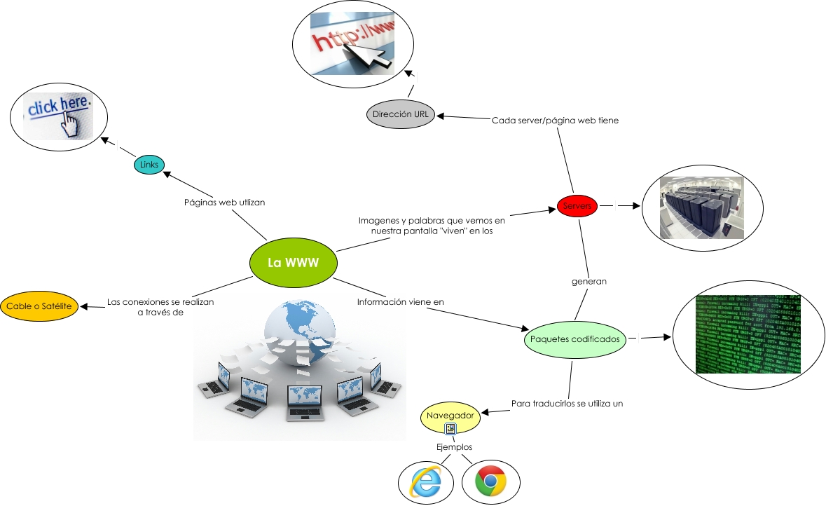 Este Cmap, tiene información relacionada con: Alejandro Santoflaminio_La WWW, Paquetes codificados, La WWW Páginas web utlizan Links, La WWW Información viene en Paquetes codificados, Servers, Dirección URL, Navegador Ejemplos, Paquetes codificados Para traducirlos se utiliza un Navegador, La WWW Las conexiones se realizan a través de Cable o Satélite, Servers Cada server/página web tiene Dirección URL, Navegador Ejemplos, La WWW Imagenes y palabras que vemos en nuestra pantalla "viven" en los Servers, Servers generan Paquetes codificados, Links