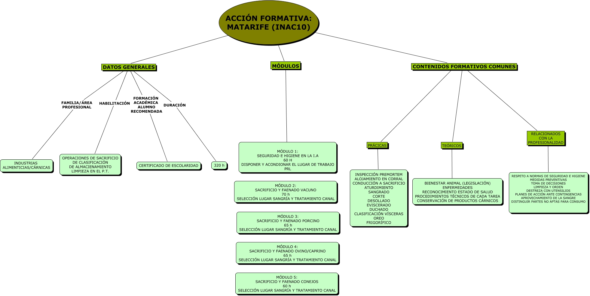 Este Cmap, tiene información relacionada con: MATARIFE, RESPETO A NORMAS DE SEGURIDAD E HIGIENE MEDIDAS PREVENTIVAS TOMA DE DECISIONES LIMPIEZA Y ORDEN DESTREZA CON UTENSILIOS PLANES DE ACCIÓN ANTE CONTINGENCIAS APROVECHAMIENTO DE LA SANGRE DISTINGUIR PARTES NO APTAS PARA CONSUMO ???? RELACIONADOS CON LA PROFESIONALIDAD, TEÓRICOS ???? BIENESTAR ANIMAL (LEGISLACIÓN) ENFERMEDADES RECONOCIMIENTO ESTADO DE SALUD PROCEDIMIENTOS TÉCNICOS DE CADA TAREA CONSERVACIÓN DE PRODUCTOS CÁRNICOS, CONTENIDOS FORMATIVOS COMUNES ???? TEÓRICOS, ACCIÓN FORMATIVA: MATARIFE (INAC10) ???? DATOS GENERALES, DATOS GENERALES DURACIÓN 320 h, ACCIÓN FORMATIVA: MATARIFE (INAC10) ???? MÓDULOS, CONTENIDOS FORMATIVOS COMUNES ???? PRÁCICAS, MÓDULOS ???? MÓDULO 1: SEGURIDAD E HIGIENE EN LA I.A 60 H DISPONER Y ACONDIONAR EL LUGAR DE TRABAJO PRL, PRÁCICAS ???? INSPECCIÓN PREMORTEM ALOJAMIENTO EN CORRAL CONDUCCIÓN A SACRIFICIO ATURDIMIENTO SANGRADO CORTE DESOLLADO EVISCERADO DUCHADO CLASIFICACIÓN VÍSCERAS OREO FRIGORÍFICO, DATOS GENERALES HABILITACIÓN OPERACIONES DE SACRIFICIO DE CLASIFICACIÓN DE ALMACIENAMIENTO LIMPIEZA EN EL P.T., CONTENIDOS FORMATIVOS COMUNES ???? RELACIONADOS CON LA PROFESIONALIDAD, ACCIÓN FORMATIVA: MATARIFE (INAC10) ???? CONTENIDOS FORMATIVOS COMUNES, DATOS GENERALES FORMACIÓN ACADÉMICA ALUMNO RECOMENDADA CERTIFICADO DE ESCOLARIDAD, DATOS GENERALES FAMILIA/ÁREA PROFESIONAL INDUSTRIAS ALIMENTICIAS/CÁRNICAS