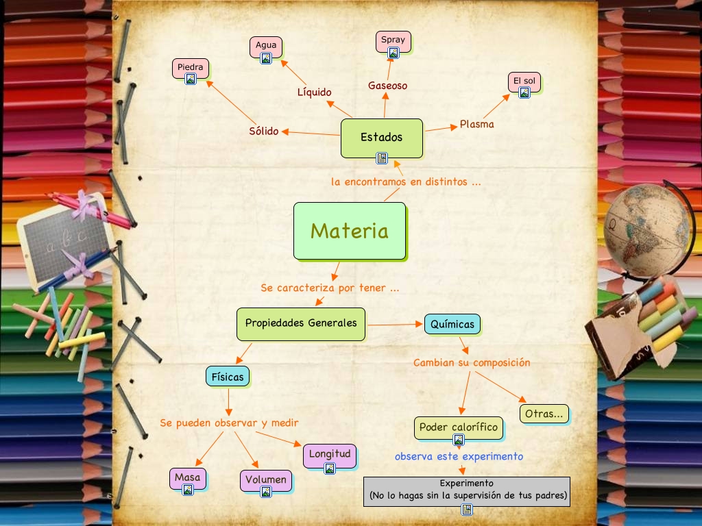 Este Cmap, tiene información relacionada con: Propiedades de la materia, Materia Se caracteriza por tener ... Propiedades Generales, Químicas Cambian su composición Otras..., Estados Líquido Agua, Químicas Cambian su composición Poder calorífico, Físicas Se pueden observar y medir Masa, Materia la encontramos en distintos ... Estados, Físicas Se pueden observar y medir Volumen, Estados Sólido Piedra, Estados Plasma El sol, Poder calorífico observa este experimento Experimento (No lo hagas sin la supervisión de tus padres), Propiedades Generales ???? Físicas, Propiedades Generales ???? Químicas, Físicas Se pueden observar y medir Longitud, Estados Gaseoso Spray