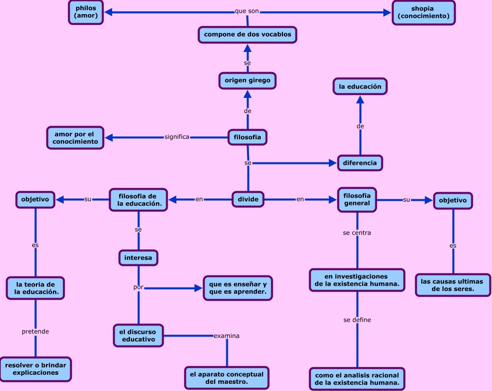 Este Cmap, tiene información relacionada con: filosofia.cmap, diferencia de la educación, en investigaciones de la existencia humana. se define como el analisis racional de la existencia humana., interesa por el discurso educativo, objetivo es las causas ultimas de los seres., el discurso educativo examina el aparato conceptual del maestro., la teoria de la educación. pretende resolver o brindar explicaciones, filosofia significa amor por el conocimiento, filosofia se divide, interesa por que es enseñar y que es aprender., filosofia de la educación. su objetivo, origen girego se compone de dos vocablos, compone de dos vocablos que son philos (amor), divide en filosofia general, filosofia general se centra en investigaciones de la existencia humana., filosofia de la educación. se interesa, filosofia general su objetivo, filosofia se diferencia, objetivo es la teoria de la educación., divide en filosofia de la educación., compone de dos vocablos que son shopia (conocimiento)