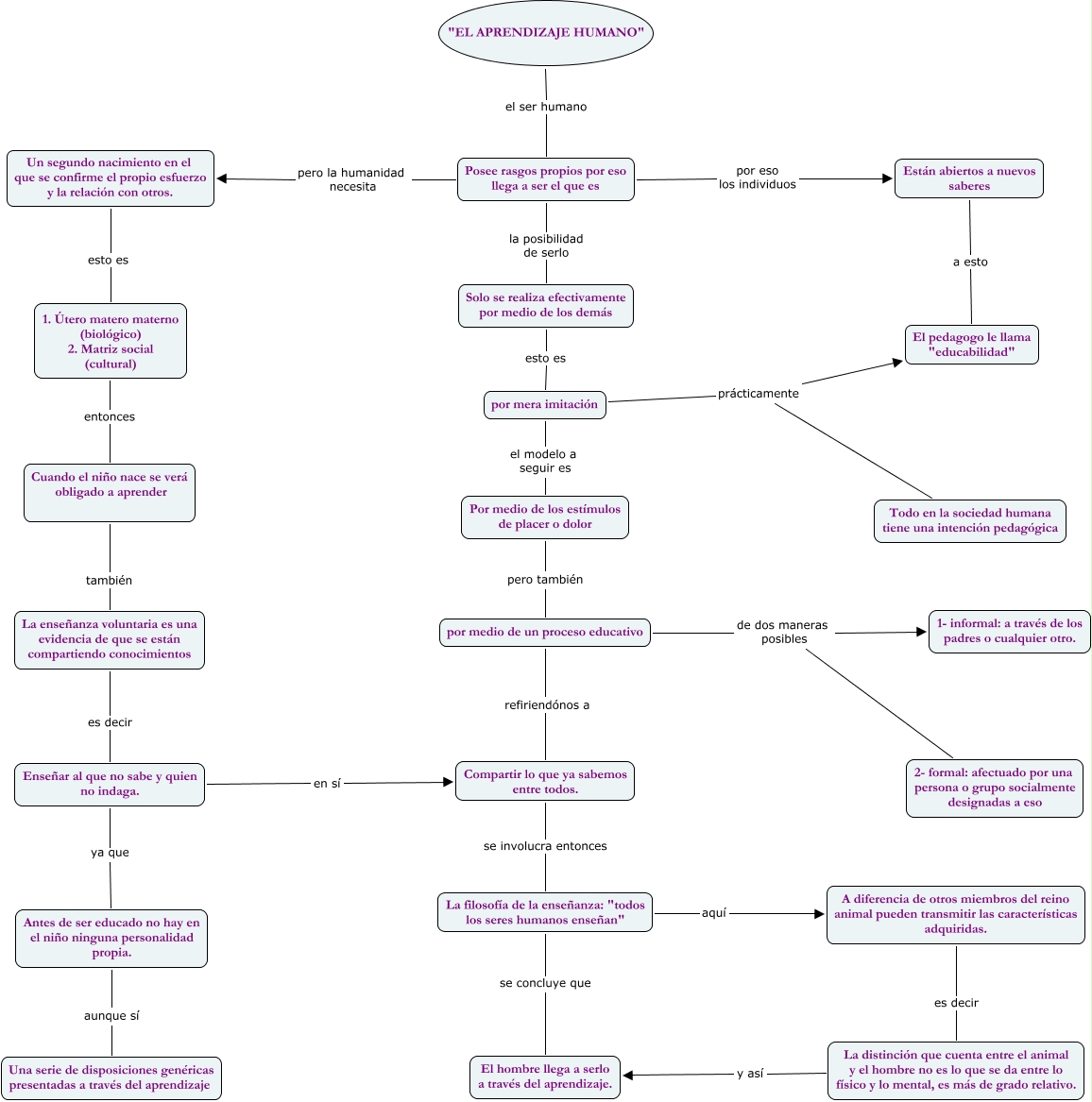 Este Cmap, tiene información relacionada con: Aprendizaje humano, por medio de un proceso educativo refiriendónos a Compartir lo que ya sabemos entre todos., "EL APRENDIZAJE HUMANO" el ser humano Posee rasgos propios por eso llega a ser el que es, Cuando el niño nace se verá obligado a aprender también La enseñanza voluntaria es una evidencia de que se están compartiendo conocimientos, Posee rasgos propios por eso llega a ser el que es pero la humanidad necesita Un segundo nacimiento en el que se confirme el propio esfuerzo y la relación con otros., Un segundo nacimiento en el que se confirme el propio esfuerzo y la relación con otros. esto es 1. Útero matero materno (biológico) 2. Matriz social (cultural), Están abiertos a nuevos saberes a esto El pedagogo le llama "educabilidad", Posee rasgos propios por eso llega a ser el que es la posibilidad de serlo Solo se realiza efectivamente por medio de los demás, por medio de un proceso educativo de dos maneras posibles 1- informal: a través de los padres o cualquier otro., por medio de un proceso educativo de dos maneras posibles 2- formal: afectuado por una persona o grupo socialmente designadas a eso, por mera imitación prácticamente El pedagogo le llama "educabilidad", Compartir lo que ya sabemos entre todos. se involucra entonces La filosofía de la enseñanza: "todos los seres humanos enseñan", por mera imitación el modelo a seguir es Por medio de los estímulos de placer o dolor, 1. Útero matero materno (biológico) 2. Matriz social (cultural) entonces Cuando el niño nace se verá obligado a aprender, Posee rasgos propios por eso llega a ser el que es por eso los individuos Están abiertos a nuevos saberes, Solo se realiza efectivamente por medio de los demás esto es por mera imitación, A diferencia de otros miembros del reino animal pueden transmitir las características adquiridas. es decir La distinción que cuenta entre el animal y el hombre no es lo que se da entre lo físico y lo mental, es más de grado relativo., Enseñar al que no sabe y quien no indaga. ya que Antes de ser educado no hay en el niño ninguna personalidad propia., La filosofía de la enseñanza: "todos los seres humanos enseñan" se concluye que El hombre llega a serlo a través del aprendizaje., Enseñar al que no sabe y quien no indaga. en sí Compartir lo que ya sabemos entre todos., Por medio de los estímulos de placer o dolor pero también por medio de un proceso educativo
