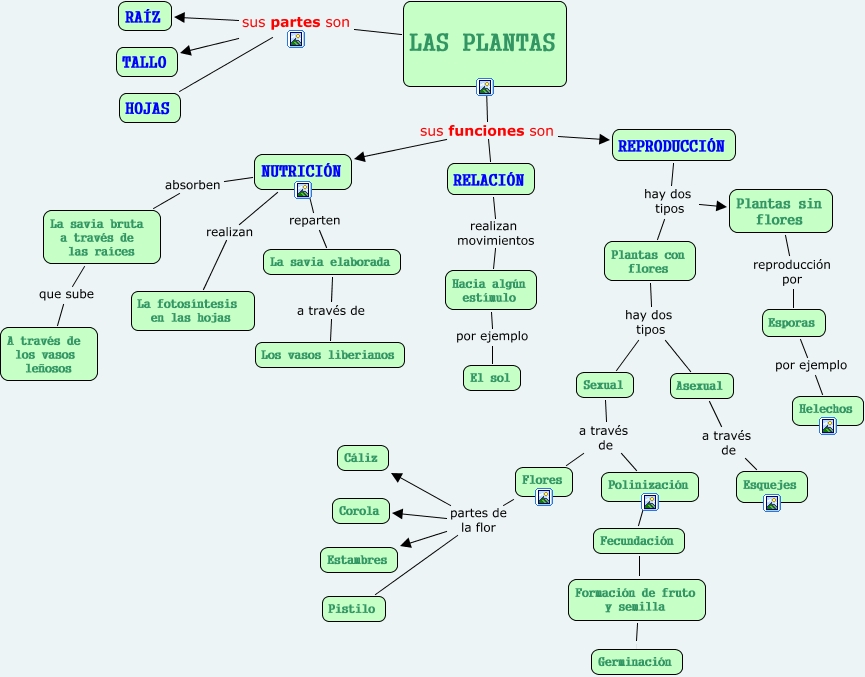 Este Cmap, tiene información relacionada con: Las plantas, Esporas por ejemplo Helechos, La savia elaborada a través de Los vasos liberianos, Flores partes de la flor Corola, Formación de fruto y semilla Germinación, Asexual a través de Esquejes, Flores partes de la flor Cáliz, NUTRICIÓN realizan La fotosíntesis en las hojas, Flores partes de la flor Pistilo, Sexual a través de Polinización, NUTRICIÓN reparten La savia elaborada, Sexual a través de Flores, LAS PLANTAS sus partes son RAÍZ, RELACIÓN realizan movimientos Hacia algún estímulo, Hacia algún estímulo por ejemplo El sol, LAS PLANTAS sus funciones son RELACIÓN, LAS PLANTAS sus partes son HOJAS, LAS PLANTAS sus partes son TALLO, Fecundación Formación de fruto y semilla, Polinización Fecundación, LAS PLANTAS sus funciones son NUTRICIÓN