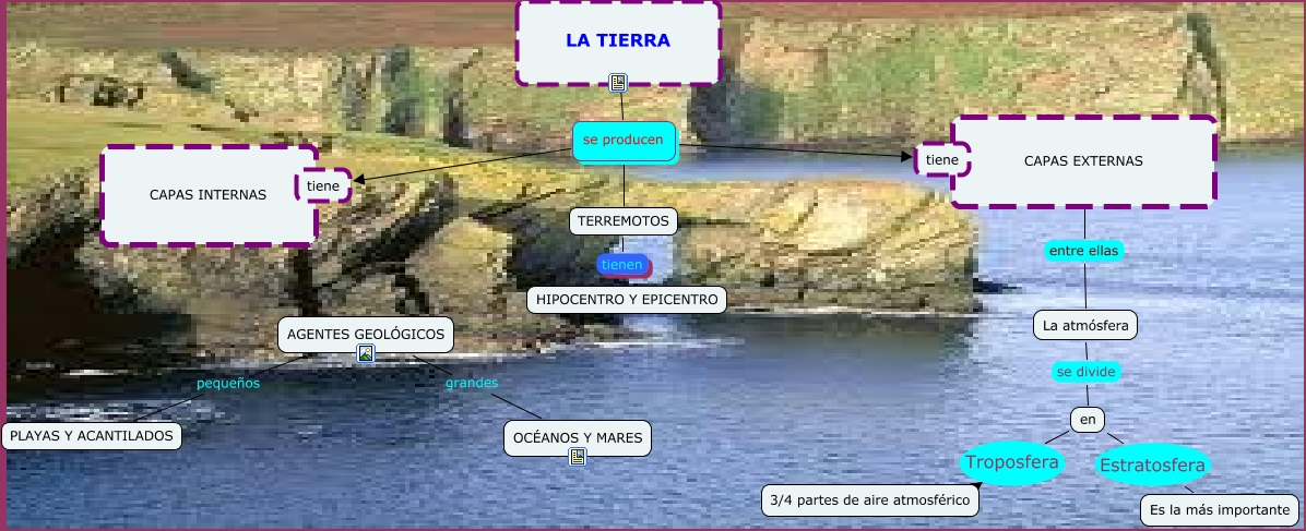 Este Cmap, tiene información relacionada con: La Tierra, CAPAS EXTERNAS entre ellas La atmósfera, LA TIERRA se producen tiene, LA TIERRA se producen tiene, en Estratosfera Es la más importante, AGENTES GEOLÓGICOS pequeños PLAYAS Y ACANTILADOS, en Troposfera 3/4 partes de aire atmosférico, TERREMOTOS tienen HIPOCENTRO Y EPICENTRO, LA TIERRA se producen TERREMOTOS, AGENTES GEOLÓGICOS grandes OCÉANOS Y MARES, La atmósfera se divide en