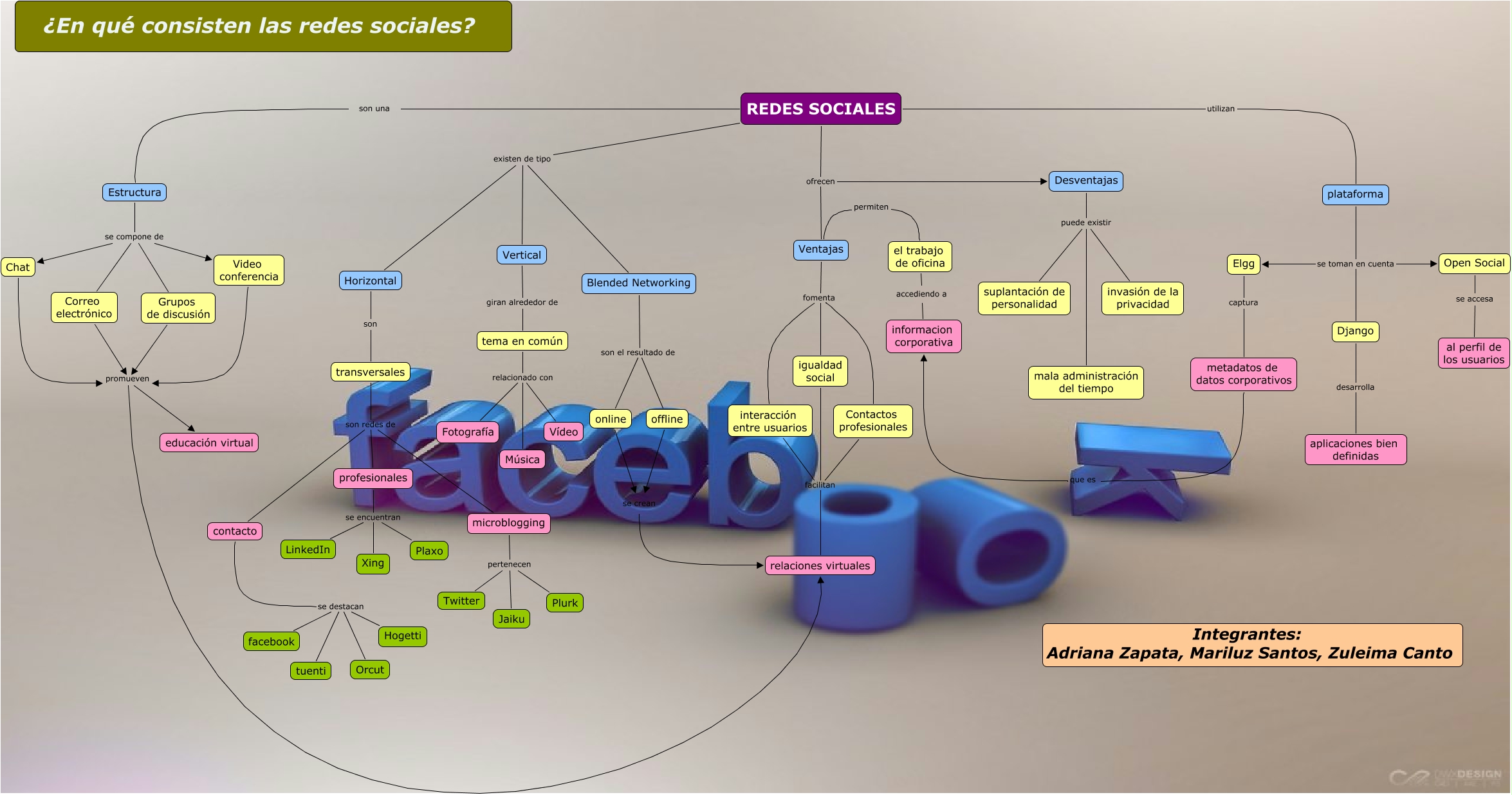 Este Cmap, tiene información relacionada con: Redes Sociales, tema en común relacionado con Música, contacto se destacan facebook, plataforma se toman en cuenta Elgg, igualdad social facilitan relaciones virtuales, Desventajas puede existir invasión de la privacidad, Ventajas fomenta interacción entre usuarios, Ventajas fomenta igualdad social, REDES SOCIALES existen de tipo Blended Networking, plataforma se toman en cuenta Django, Estructura se compone de Chat, microblogging pertenecen Jaiku, REDES SOCIALES ofrecen Desventajas, plataforma se toman en cuenta Open Social, el trabajo de oficina accediendo a informacion corporativa, Chat promueven relaciones virtuales, Contactos profesionales facilitan relaciones virtuales, Desventajas puede existir mala administración del tiempo, Blended Networking son el resultado de offline, transversales son redes de contacto, offline se crean relaciones virtuales