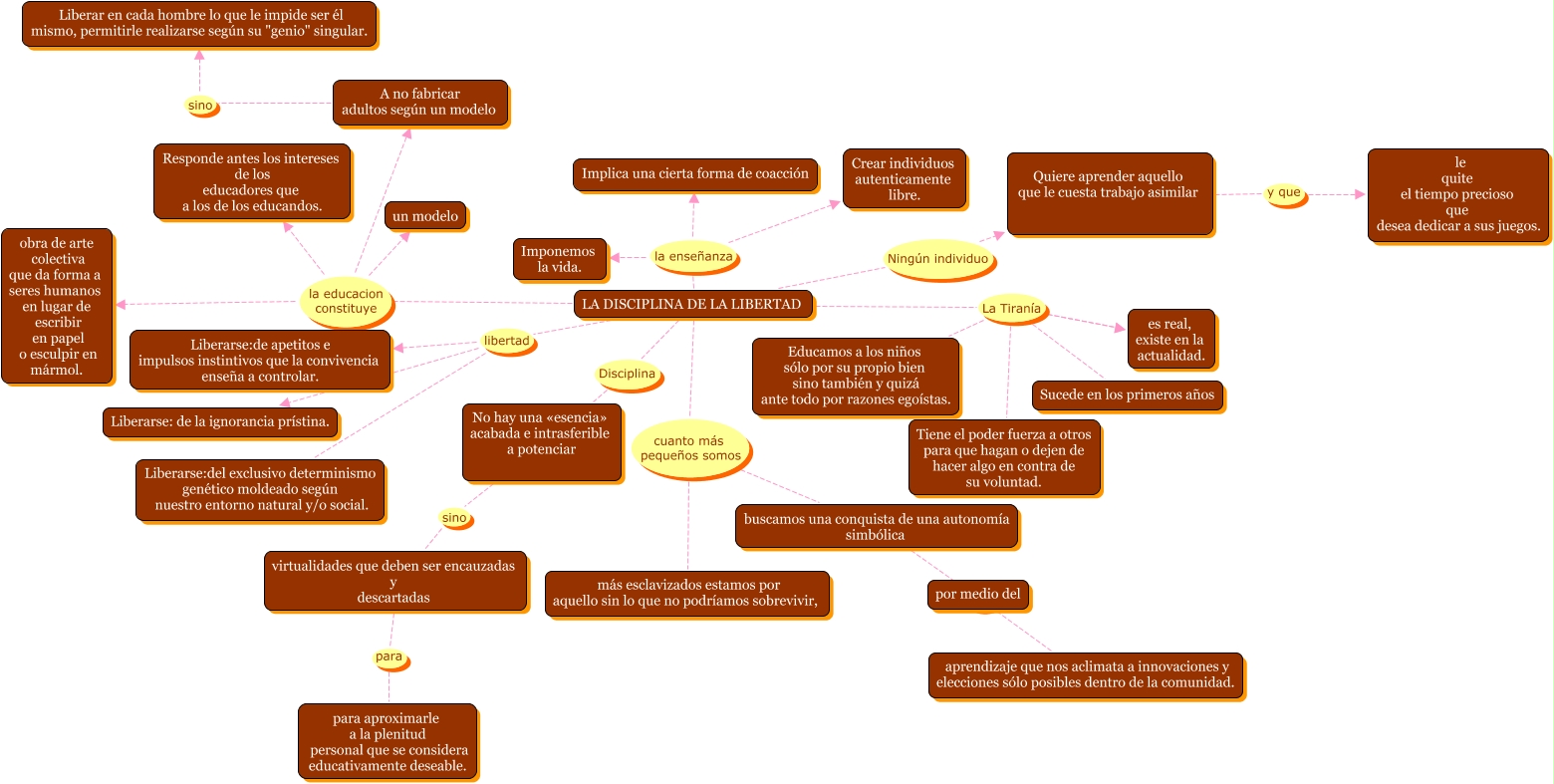 Este Cmap, tiene información relacionada con: cap IV, LA DISCIPLINA DE LA LIBERTAD La Tiranía es real, existe en la actualidad., A no fabricar adultos según un modelo sino Liberar en cada hombre lo que le impide ser él mismo, permitirle realizarse según su "genio" singular., LA DISCIPLINA DE LA LIBERTAD la enseñanza Implica una cierta forma de coacción, LA DISCIPLINA DE LA LIBERTAD Disciplina No hay una «esencia» acabada e intrasferible a potenciar, Quiere aprender aquello que le cuesta trabajo asimilar y que le quite el tiempo precioso que desea dedicar a sus juegos., LA DISCIPLINA DE LA LIBERTAD libertad Liberarse:de apetitos e impulsos instintivos que la convivencia enseña a controlar., LA DISCIPLINA DE LA LIBERTAD libertad Liberarse:del exclusivo determinismo genético moldeado según nuestro entorno natural y/o social., No hay una «esencia» acabada e intrasferible a potenciar sino virtualidades que deben ser encauzadas y descartadas, LA DISCIPLINA DE LA LIBERTAD La Tiranía Educamos a los niños sólo por su propio bien sino también y quizá ante todo por razones egoístas., LA DISCIPLINA DE LA LIBERTAD la enseñanza Crear individuos autenticamente libre., LA DISCIPLINA DE LA LIBERTAD la educacion constituye obra de arte colectiva que da forma a seres humanos en lugar de escribir en papel o esculpir en mármol., buscamos una conquista de una autonomía simbólica ???? aprendizaje que nos aclimata a innovaciones y elecciones sólo posibles dentro de la comunidad., LA DISCIPLINA DE LA LIBERTAD la enseñanza Imponemos la vida., LA DISCIPLINA DE LA LIBERTAD cuanto más pequeños somos buscamos una conquista de una autonomía simbólica, LA DISCIPLINA DE LA LIBERTAD la educacion constituye Responde antes los intereses de los educadores que a los de los educandos., LA DISCIPLINA DE LA LIBERTAD la educacion constituye un modelo, LA DISCIPLINA DE LA LIBERTAD La Tiranía es real, existe en la actualidad., LA DISCIPLINA DE LA LIBERTAD la educacion constituye A no fabricar adultos según un modelo, LA DISCIPLINA DE LA LIBERTAD Ningún individuo Quiere aprender aquello que le cuesta trabajo asimilar, LA DISCIPLINA DE LA LIBERTAD libertad Liberarse: de la ignorancia prístina.
