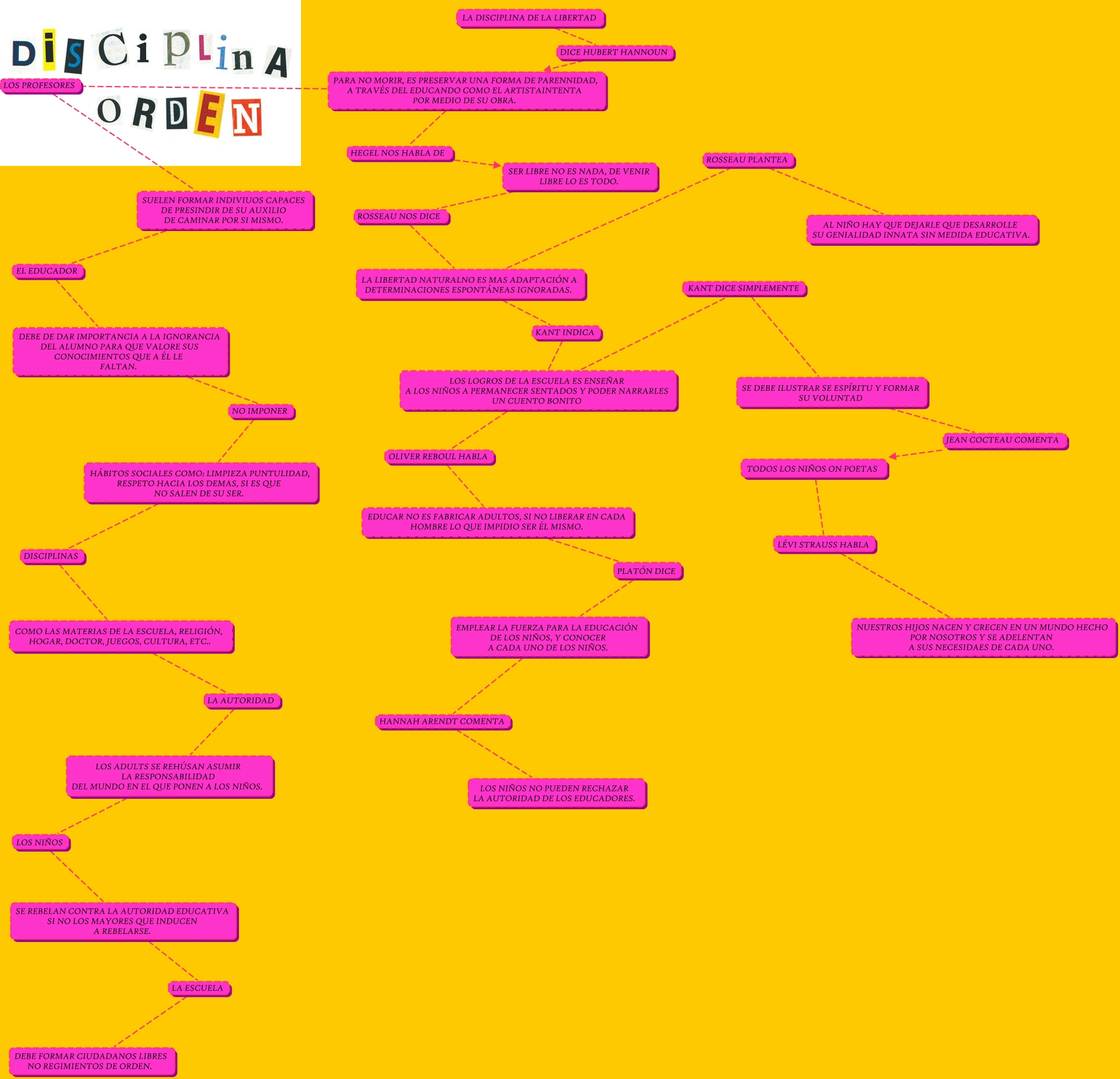 Este Cmap, tiene información relacionada con: LA DISCIPLINA DE LA LIBERTAD, PARA NO MORIR, ES PRESERVAR UNA FORMA DE PARENNIDAD, A TRAVÉS DEL EDUCANDO COMO EL ARTISTAINTENTA POR MEDIO DE SU OBRA. LOS PROFESORES SUELEN FORMAR INDIVIUOS CAPACES DE PRESINDIR DE SU AUXILIO DE CAMINAR POR SI MISMO., SUELEN FORMAR INDIVIUOS CAPACES DE PRESINDIR DE SU AUXILIO DE CAMINAR POR SI MISMO. EL EDUCADOR DEBE DE DAR IMPORTANCIA A LA IGNORANCIA DEL ALUMNO PARA QUE VALORE SUS CONOCIMIENTOS QUE A ÉL LE FALTAN., COMO LAS MATERIAS DE LA ESCUELA, RELIGIÓN, HOGAR, DOCTOR, JUEGOS, CULTURA, ETC.. LA AUTORIDAD LOS ADULTS SE REHÚSAN ASUMIR LA RESPONSABILIDAD DEL MUNDO EN EL QUE PONEN A LOS NIÑOS., SER LIBRE NO ES NADA, DE VENIR LIBRE LO ES TODO. ROSSEAU NOS DICE LA LIBERTAD NATURALNO ES MAS ADAPTACIÓN A DETERMINACIONES ESPONTÁNEAS IGNORADAS., LA LIBERTAD NATURALNO ES MAS ADAPTACIÓN A DETERMINACIONES ESPONTÁNEAS IGNORADAS. ROSSEAU PLANTEA AL NIÑO HAY QUE DEJARLE QUE DESARROLLE SU GENIALIDAD INNATA SIN MEDIDA EDUCATIVA., SE REBELAN CONTRA LA AUTORIDAD EDUCATIVA SI NO LOS MAYORES QUE INDUCEN A REBELARSE. LA ESCUELA DEBE FORMAR CIUDADANOS LIBRES NO REGIMIENTOS DE ORDEN., TODOS LOS NIÑOS ON POETAS LÉVI STRAUSS HABLA NUESTROS HIJOS NACEN Y CRECEN EN UN MUNDO HECHO POR NOSOTROS Y SE ADELENTAN A SUS NECESIDAES DE CADA UNO., EDUCAR NO ES FABRICAR ADULTOS, SI NO LIBERAR EN CADA HOMBRE LO QUE IMPIDIO SER ÉL MISMO. PLATÓN DICE EMPLEAR LA FUERZA PARA LA EDUCACIÓN DE LOS NIÑOS, Y CONOCER A CADA UNO DE LOS NIÑOS., LA DISCIPLINA DE LA LIBERTAD DICE HUBERT HANNOUN PARA NO MORIR, ES PRESERVAR UNA FORMA DE PARENNIDAD, A TRAVÉS DEL EDUCANDO COMO EL ARTISTAINTENTA POR MEDIO DE SU OBRA., LOS ADULTS SE REHÚSAN ASUMIR LA RESPONSABILIDAD DEL MUNDO EN EL QUE PONEN A LOS NIÑOS. LOS NIÑOS SE REBELAN CONTRA LA AUTORIDAD EDUCATIVA SI NO LOS MAYORES QUE INDUCEN A REBELARSE., SE DEBE ILUSTRAR SE ESPÍRITU Y FORMAR SU VOLUNTAD JEAN COCTEAU COMENTA TODOS LOS NIÑOS ON POETAS, PARA NO MORIR, ES PRESERVAR UNA FORMA DE PARENNIDAD, A TRAVÉS DEL EDUCANDO COMO EL ARTISTAINTENTA POR MEDIO DE SU OBRA. HEGEL NOS HABLA DE SER LIBRE NO ES NADA, DE VENIR LIBRE LO ES TODO., LA LIBERTAD NATURALNO ES MAS ADAPTACIÓN A DETERMINACIONES ESPONTÁNEAS IGNORADAS. KANT INDICA LOS LOGROS DE LA ESCUELA ES ENSEÑAR A LOS NIÑOS A PERMANECER SENTADOS Y PODER NARRARLES UN CUENTO BONITO, HÁBITOS SOCIALES COMO: LIMPIEZA PUNTULIDAD, RESPETO HACIA LOS DEMAS, SI ES QUE NO SALEN DE SU SER. DISCIPLINAS COMO LAS MATERIAS DE LA ESCUELA, RELIGIÓN, HOGAR, DOCTOR, JUEGOS, CULTURA, ETC.., DEBE DE DAR IMPORTANCIA A LA IGNORANCIA DEL ALUMNO PARA QUE VALORE SUS CONOCIMIENTOS QUE A ÉL LE FALTAN. NO IMPONER HÁBITOS SOCIALES COMO: LIMPIEZA PUNTULIDAD, RESPETO HACIA LOS DEMAS, SI ES QUE NO SALEN DE SU SER., LOS LOGROS DE LA ESCUELA ES ENSEÑAR A LOS NIÑOS A PERMANECER SENTADOS Y PODER NARRARLES UN CUENTO BONITO OLIVER REBOUL HABLA EDUCAR NO ES FABRICAR ADULTOS, SI NO LIBERAR EN CADA HOMBRE LO QUE IMPIDIO SER ÉL MISMO., LOS LOGROS DE LA ESCUELA ES ENSEÑAR A LOS NIÑOS A PERMANECER SENTADOS Y PODER NARRARLES UN CUENTO BONITO KANT DICE SIMPLEMENTE SE DEBE ILUSTRAR SE ESPÍRITU Y FORMAR SU VOLUNTAD, EMPLEAR LA FUERZA PARA LA EDUCACIÓN DE LOS NIÑOS, Y CONOCER A CADA UNO DE LOS NIÑOS. HANNAH ARENDT COMENTA LOS NIÑOS NO PUEDEN RECHAZAR LA AUTORIDAD DE LOS EDUCADORES.