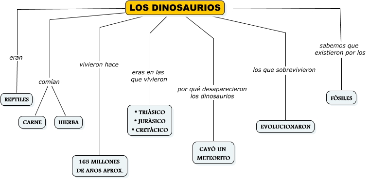 Este Cmap, tiene información relacionada con: Los Dinosaurios, LOS DINOSAURIOS vivieron hace 165 MILLONES DE AÑOS APROX., LOS DINOSAURIOS comían CARNE, LOS DINOSAURIOS eras en las que vivieron * TRIÁSICO * JURÁSICO * CRETÁCICO, LOS DINOSAURIOS los que sobrevivieron EVOLUCIONARON, LOS DINOSAURIOS por qué desaparecieron los dinosaurios CAYÓ UN METEORITO, LOS DINOSAURIOS sabemos que existieron por los FÓSILES, LOS DINOSAURIOS eran REPTILES, LOS DINOSAURIOS comían HIERBA