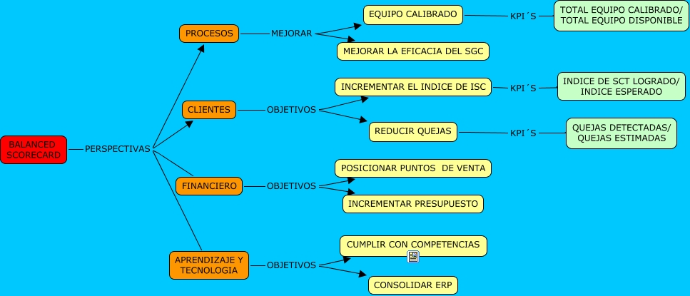 Este Cmap, tiene información relacionada con: balancedscorecard, FINANCIERO OBJETIVOS POSICIONAR PUNTOS DE VENTA, BALANCED SCORECARD PERSPECTIVAS FINANCIERO, APRENDIZAJE Y TECNOLOGIA OBJETIVOS CUMPLIR CON COMPETENCIAS, CLIENTES OBJETIVOS REDUCIR QUEJAS, CLIENTES OBJETIVOS INCREMENTAR EL INDICE DE ISC, INCREMENTAR EL INDICE DE ISC KPI´S INDICE DE SCT LOGRADO/ INDICE ESPERADO, APRENDIZAJE Y TECNOLOGIA OBJETIVOS CONSOLIDAR ERP, PROCESOS MEJORAR EQUIPO CALIBRADO, EQUIPO CALIBRADO KPI´S TOTAL EQUIPO CALIBRADO/ TOTAL EQUIPO DISPONIBLE, BALANCED SCORECARD PERSPECTIVAS CLIENTES, BALANCED SCORECARD PERSPECTIVAS APRENDIZAJE Y TECNOLOGIA, FINANCIERO OBJETIVOS INCREMENTAR PRESUPUESTO, BALANCED SCORECARD PERSPECTIVAS PROCESOS, PROCESOS MEJORAR MEJORAR LA EFICACIA DEL SGC, REDUCIR QUEJAS KPI´S QUEJAS DETECTADAS/ QUEJAS ESTIMADAS