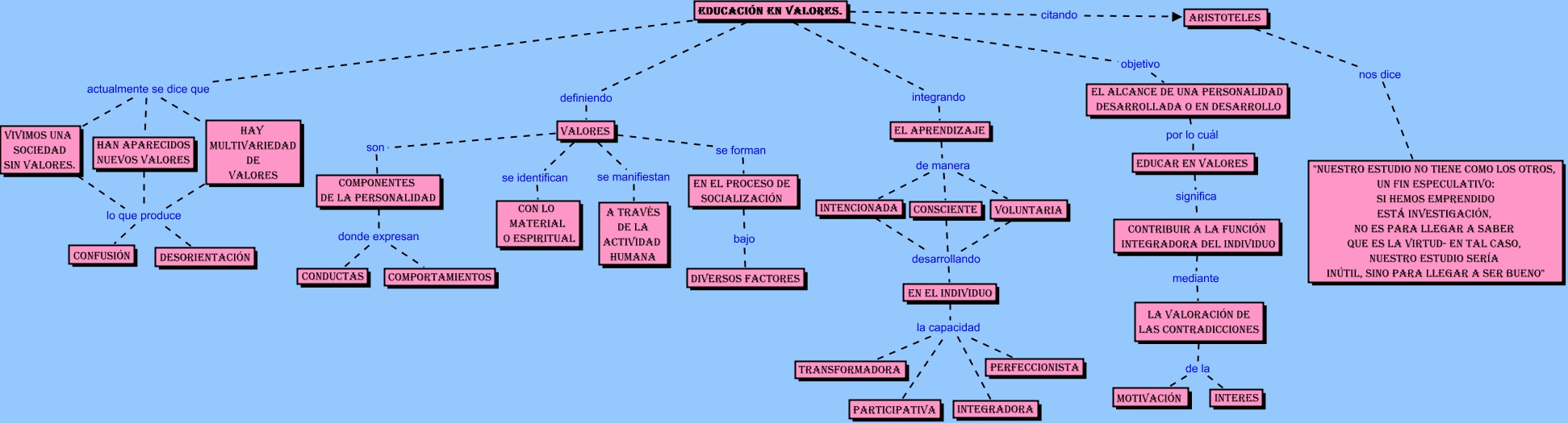 Este Cmap, tiene información relacionada con: EDUCACIÓN EN VALORES, componentes de la personalidad donde expresan comportamientos, valores son componentes de la personalidad, educar en valores significa contribuir a la función integradora del individuo, la valoración de las contradicciones de la interes, en el individuo la capacidad transformadora, desorientación lo que produce confusión, EDUCACIÓN EN VALORES. actualmente se dice que han aparecidos nuevos valores, valores se forman en el proceso de socialización, el alcance de una personalidad desarrollada o en desarrollo por lo cuál educar en valores, el aprendizaje de manera intencionada, contribuir a la función integradora del individuo mediante la valoración de las contradicciones, el aprendizaje de manera consciente, han aparecidos nuevos valores lo que produce confusión, consciente desarrollando en el individuo, vivimos una sociedad sin valores. lo que produce confusión, hay multivariedad de valores lo que produce confusión, en el proceso de socialización bajo diversos factores, la valoración de las contradicciones de la motivación, el aprendizaje de manera voluntaria, componentes de la personalidad donde expresan conductas