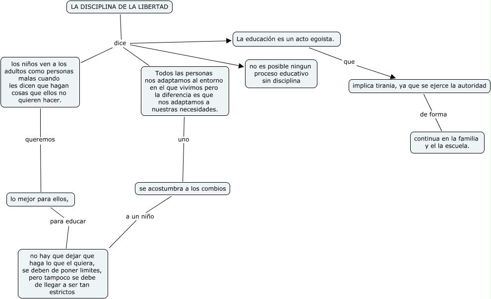 Este Cmap, tiene información relacionada con: capitulo IV, los niños ven a los adultos como personas malas cuando les dicen que hagan cosas que ellos no quieren hacer. queremos lo mejor para ellos,, implica tirania, ya que se ejerce la autoridad de forma continua en la familia y el la escuela., LA DISCIPLINA DE LA LIBERTAD dice los niños ven a los adultos como personas malas cuando les dicen que hagan cosas que ellos no quieren hacer., lo mejor para ellos, para educar no hay que dejar que haga lo que el quiera, se deben de poner limites, pero tampoco se debe de llegar a ser tan estrictos, Todos las personas nos adaptamos al entorno en el que vivimos pero la diferencia es que nos adaptamos a nuestras necesidades. uno se acostumbra a los combios, LA DISCIPLINA DE LA LIBERTAD dice La educación es un acto egoista., LA DISCIPLINA DE LA LIBERTAD dice Todos las personas nos adaptamos al entorno en el que vivimos pero la diferencia es que nos adaptamos a nuestras necesidades., se acostumbra a los combios a un niño no hay que dejar que haga lo que el quiera, se deben de poner limites, pero tampoco se debe de llegar a ser tan estrictos, La educación es un acto egoista. que implica tirania, ya que se ejerce la autoridad, LA DISCIPLINA DE LA LIBERTAD dice no es posible ningun proceso educativo sin disciplina