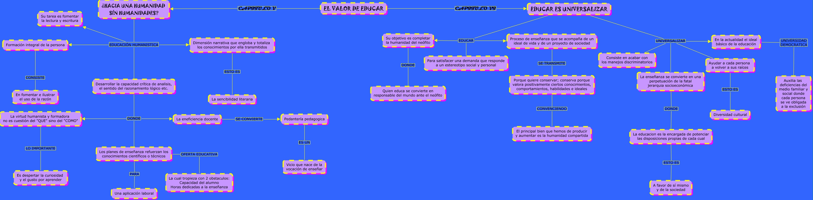 Este Cmap, tiene información relacionada con: Cap. V y VI, EDUCAR ES UNIVERSALIZAR UNIVERSALIZAR En la actualidad el ideal básico de la educación, Los planes de enseñanza refuerzan los conocimientos científicos o técnicos OFERTA EDUCATIVA La cual tropieza con 2 obstaculos: Capacidad del alumno Horas dedicadas a la enseñanza, Formación integral de la persona CONSISTE En fomentar e ilustrar el uso de la razón, EL VALOR DE EDUCAR CAPITULO V ¿HACIA UNA HUMANIDAD SÍN HUMANIDADES?, En la actualidad el ideal básico de la educación UNIVERSIDAD DEMOCRATICA Auxilia las deficiencias del medio familiar y social donde cada persona se ve obligada a la exclusión, ¿HACIA UNA HUMANIDAD SÍN HUMANIDADES? EDUCACIÓN HUMANISTICA Formación integral de la persona, EDUCAR ES UNIVERSALIZAR UNIVERSALIZAR Ayudar a cada persona a volver a sus raíces, Su objetivo es completar la humanidad del neófito DONDE Quien educa se convierte en responsable del mundo ante el neófito, Desarrollar la capacidad crítica de analisis, el sentido del razonamiento lógico etc. DONDE Los planes de enseñanza refuerzan los conocimientos científicos o técnicos, EDUCAR ES UNIVERSALIZAR EDUCAR Proceso de enseñanza que se acompaña de un ideal de vida y de un proyecto de sociedad, EDUCAR ES UNIVERSALIZAR EDUCAR Para satisfacer una demanda que responde a un estereotipo social y personal, La virtud humanista y formadora no es cuestión del "QUE" sino del "COMO" LO IMPORTANTE Es despertar la curiosidad y el gusto por aprender, Los planes de enseñanza refuerzan los conocimientos científicos o técnicos PARA Una aplicación laboral, Ayudar a cada persona a volver a sus raíces ESTO ES Diversidad cultural, Pedantería pedagogica ES UN Vicio que nace de la vocación de enseñar, EL VALOR DE EDUCAR CAPITULO VI EDUCAR ES UNIVERSALIZAR, ¿HACIA UNA HUMANIDAD SÍN HUMANIDADES? EDUCACIÓN HUMANISTICA Su tarea es fomentar la lectura y escritura, EDUCAR ES UNIVERSALIZAR UNIVERSALIZAR La enseñanza se convierte en una perpetuación de la fatal jerarquia socioeconómica, Porque quiere conservar; conserva porque valora positivamente ciertos conocimientos, comportamientos, habilidades e ideales CONVENCIENDO El principal bien que hemos de producir y aumentar es la humanidad compartida, Proceso de enseñanza que se acompaña de un ideal de vida y de un proyecto de sociedad SE TRANSMITE Porque quiere conservar; conserva porque valora positivamente ciertos conocimientos, comportamientos, habilidades e ideales