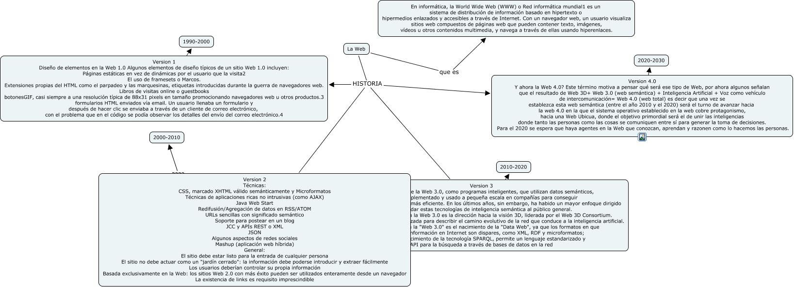 Este Cmap, tiene información relacionada con: Mapa WEB, Version 2 Técnicas: CSS, marcado XHTML válido semánticamente y Microformatos Técnicas de aplicaciones ricas no intrusivas (como AJAX) Java Web Start Redifusión/Agregación de datos en RSS/ATOM URLs sencillas con significado semántico Soporte para postear en un blog JCC y APIs REST o XML JSON Algunos aspectos de redes sociales Mashup (aplicación web híbrida) General: El sitio debe estar listo para la entrada de cualquier persona El sitio no debe actuar como un "jardín cerrado": la información debe poderse introducir y extraer fácilmente Los usuarios deberían controlar su propia información Basada exclusivamente en la Web: los sitios Web 2.0 con más éxito pueden ser utilizados enteramente desde un navegador La existencia de links es requisito imprescindible ???? 2000-2010, Version 4.0 Y ahora la Web 4.0? Este término motiva a pensar qué será ese tipo de Web, por ahora algunos señalan que el resultado de Web 3D+ Web 3.0 (web semántica) + Inteligencia Artificial + Voz como vehículo de intercomunicación= Web 4.0 (web total) es decir que una vez se establezca esta web semántica (entre el año 2010 y el 2020) será el turno de avanzar hacia la web 4.0 en la que el sistema operativo establecido en la web cobre protagonismo, hacia una Web Ubicua, donde el objetivo primordial será el de unir las inteligencias donde tanto las personas como las cosas se comuniquen entre sí para generar la toma de decisiones. Para el 2020 se espera que haya agentes en la Web que conozcan, aprendan y razonen como lo hacemos las personas. ???? 2020-2030, Version 1 Diseño de elementos en la Web 1.0 Algunos elementos de diseño típicos de un sitio Web 1.0 incluyen: Páginas estáticas en vez de dinámicas por el usuario que la visita2 El uso de framesets o Marcos. Extensiones propias del HTML como el parpadeo y las marquesinas, etiquetas introducidas durante la guerra de navegadores web. Libros de visitas online o guestbooks botonesGIF, casi siempre a una resolución típica de 88x31 pixels en tamaño promocionando navegadores web u otros productos.3 formularios HTML enviados vía email. Un usuario llenaba un formulario y después de hacer clic se enviaba a través de un cliente de correo electrónico, con el problema que en el código se podía observar los detalles del envío del correo electrónico.4 ???? 1990-2000, La Web que es En informática, la World Wide Web (WWW) o Red informática mundial1 es un sistema de distribución de información basado en hipertexto o hipermedios enlazados y accesibles a través de Internet. Con un navegador web, un usuario visualiza sitios web compuestos de páginas web que pueden contener texto, imágenes, vídeos u otros contenidos multimedia, y navega a través de ellas usando hiperenlaces., La Web HISTORIA Version 3 Las tecnologías de la Web 3.0, como programas inteligentes, que utilizan datos semánticos, se han implementado y usado a pequeña escala en compañías para conseguir una manipulación de datos más eficiente. En los últimos años, sin embargo, ha habido un mayor enfoque dirigido a trasladar estas tecnologías de inteligencia semántica al público general. Otro posible camino para la Web 3.0 es la dirección hacia la visión 3D, liderada por el Web 3D Consortium. Web 3.0 también ha sido utilizada para describir el camino evolutivo de la red que conduce a la inteligencia artificial. El primer paso hacia la "Web 3.0" es el nacimiento de la "Data Web", ya que los formatos en que se publica la información en Internet son dispares, como XML, RDF y microformatos; el reciente crecimiento de la tecnología SPARQL, permite un lenguaje estandarizado y API para la búsqueda a través de bases de datos en la red, La Web HISTORIA Version 4.0 Y ahora la Web 4.0? Este término motiva a pensar qué será ese tipo de Web, por ahora algunos señalan que el resultado de Web 3D+ Web 3.0 (web semántica) + Inteligencia Artificial + Voz como vehículo de intercomunicación= Web 4.0 (web total) es decir que una vez se establezca esta web semántica (entre el año 2010 y el 2020) será el turno de avanzar hacia la web 4.0 en la que el sistema operativo establecido en la web cobre protagonismo, hacia una Web Ubicua, donde el objetivo primordial será el de unir las inteligencias donde tanto las personas como las cosas se comuniquen entre sí para generar la toma de decisiones. Para el 2020 se espera que haya agentes en la Web que conozcan, aprendan y razonen como lo hacemos las personas., La Web HISTORIA Version 2 Técnicas: CSS, marcado XHTML válido semánticamente y Microformatos Técnicas de aplicaciones ricas no intrusivas (como AJAX) Java Web Start Redifusión/Agregación de datos en RSS/ATOM URLs sencillas con significado semántico Soporte para postear en un blog JCC y APIs REST o XML JSON Algunos aspectos de redes sociales Mashup (aplicación web híbrida) General: El sitio debe estar listo para la entrada de cualquier persona El sitio no debe actuar como un "jardín cerrado": la información debe poderse introducir y extraer fácilmente Los usuarios deberían controlar su propia información Basada exclusivamente en la Web: los sitios Web 2.0 con más éxito pueden ser utilizados enteramente desde un navegador La existencia de links es requisito imprescindible, La Web HISTORIA Version 1 Diseño de elementos en la Web 1.0 Algunos elementos de diseño típicos de un sitio Web 1.0 incluyen: Páginas estáticas en vez de dinámicas por el usuario que la visita2 El uso de framesets o Marcos. Extensiones propias del HTML como el parpadeo y las marquesinas, etiquetas introducidas durante la guerra de navegadores web. Libros de visitas online o guestbooks botonesGIF, casi siempre a una resolución típica de 88x31 pixels en tamaño promocionando navegadores web u otros productos.3 formularios HTML enviados vía email. Un usuario llenaba un formulario y después de hacer clic se enviaba a través de un cl
