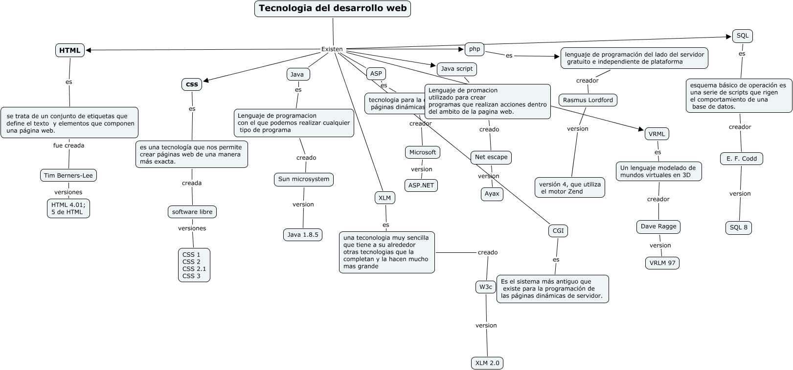 Este Cmap, tiene información relacionada con: tecnologia desarrollo web, Rasmus Lordford version versión 4, que utiliza el motor Zend, Tecnologia del desarrollo web Existen css, HTML es se trata de un conjunto de etiquetas que define el texto y elementos que componen una página web., W3c version XLM 2.0, php es lenguaje de programación del lado del servidor gratuito e independiente de plataforma, Tecnologia del desarrollo web Existen Java script, software libre versiones CSS 1 CSS 2 CSS 2.1 CSS 3, Tecnologia del desarrollo web Existen VRML, Un lenguaje modelado de mundos virtuales en 3D creador Dave Ragge, E. F. Codd version SQL 8, esquema básico de operación es una serie de scripts que rigen el comportamiento de una base de datos. creador E. F. Codd, Net escape version Ayax, Tecnologia del desarrollo web Existen HTML, tecnologia para la creación de páginas dinámicas del servidor. creador Microsoft, Lenguaje de promacion utilizado para crear programas que realizan acciones dentro del ambito de la pagina web. creado Net escape, una teconologia muy sencilla que tiene a su alrededor otras tecnologias que la completan y la hacen mucho mas grande creado W3c, SQL es esquema básico de operación es una serie de scripts que rigen el comportamiento de una base de datos., CGI es Es el sistema más antiguo que existe para la programación de las páginas dinámicas de servidor., Tecnologia del desarrollo web Existen CGI, css es es una tecnología que nos permite crear páginas web de una manera más exacta.