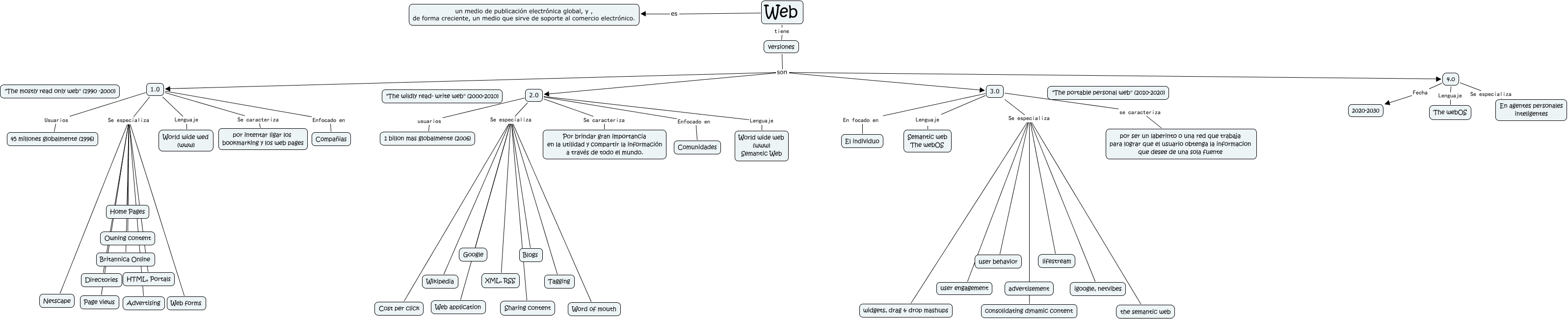 Este Cmap, tiene información relacionada con: La web1, versiones son 3.0, 3.0 En focado en El individuo, Web tiene versiones, 2.0 Se especializa Sharing content, 2.0 usuarios 1 billon mas globalmente (2006), 1.0 Usuarios 45 millones globalmente (1996), 3.0 Se especializa user behavior, 1.0 Enfocado en Compañias, versiones son 4.0, 4.0 Se especializa En agentes personales inteligentes, 3.0 Se especializa the semantic web, versiones son 2.0, 1.0 Se caracteriza por intentar ligar los bookmarking y los web pages, 2.0 Se especializa Google, 2.0 Se especializa Web application, 1.0 Se especializa Home Pages, 3.0 se caracteriza por ser un laberinto o una red que trabaja para lograr que el usuario obtenga la informacion que desee de una sola fuente, 2.0 Se caracteriza Por brindar gran importancia en la utilidad y compartir la información a través de todo el mundo., 1.0 Se especializa Netscape, 2.0 Se especializa Cost per click