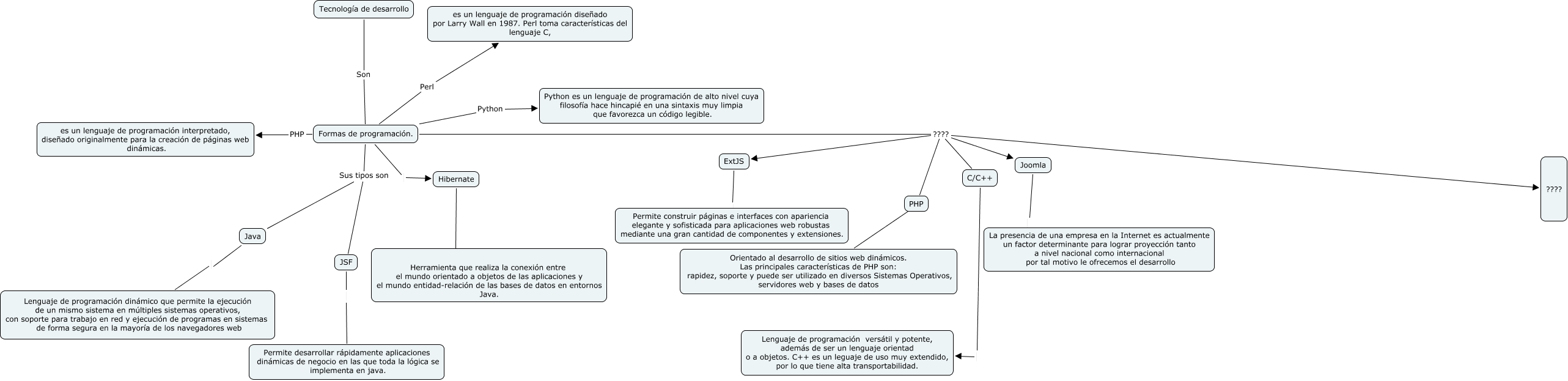 Este Cmap, tiene información relacionada con: Tweb, Formas de programación. ???? Joomla, Formas de programación. Hibernate, C/C++ Lenguaje de programación versátil y potente, además de ser un lenguaje orientad o a objetos. C++ es un leguaje de uso muy extendido, por lo que tiene alta transportabilidad., Formas de programación. Sus tipos son Java, PHP ???? Orientado al desarrollo de sitios web dinámicos. Las principales características de PHP son: rapidez, soporte y puede ser utilizado en diversos Sistemas Operativos, servidores web y bases de datos, Formas de programación. ???? ????, Formas de programación. PHP es un lenguaje de programación interpretado, diseñado originalmente para la creación de páginas web dinámicas., Formas de programación. ???? ExtJS, Formas de programación. Python Python es un lenguaje de programación de alto nivel cuya filosofía hace hincapié en una sintaxis muy limpia que favorezca un código legible., Formas de programación. Sus tipos son JSF, Tecnología de desarrollo Son Formas de programación., Joomla La presencia de una empresa en la Internet es actualmente un factor determinante para lograr proyección tanto a nivel nacional como internacional por tal motivo le ofrecemos el desarrollo, ExtJS Permite construir páginas e interfaces con apariencia elegante y sofisticada para aplicaciones web robustas mediante una gran cantidad de componentes y extensiones., JSF Permite desarrollar rápidamente aplicaciones dinámicas de negocio en las que toda la lógica se implementa en java., Hibernate Herramienta que realiza la conexión entre el mundo orientado a objetos de las aplicaciones y el mundo entidad-relación de las bases de datos en entornos Java., Java Lenguaje de programación dinámico que permite la ejecución de un mismo sistema en múltiples sistemas operativos, con soporte para trabajo en red y ejecución de programas en sistemas de forma segura en la mayoría de los navegadores web, Formas de programación. Perl es un lenguaje de programación diseñado por Larry Wall en 1987. Perl toma características del lenguaje C,, Formas de programación. ???? C/C++, Formas de programación. ???? PHP