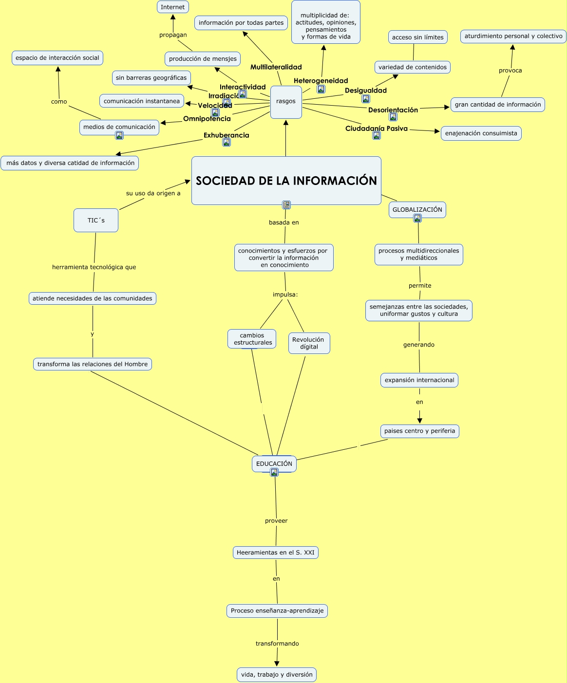 Este Cmap, tiene información relacionada con: Sociedad de la Información, medios de comunicación como espacio de interacción social, EDUCACIÓN proveer Heeramientas en el S. XXI, atiende necesidades de las comunidades y transforma las relaciones del Hombre, GLOBALIZACIÓN procesos multidireccionales y mediáticos, conocimientos y esfuerzos por convertir la información en conocimiento impulsa: Revolución dígital, procesos multidireccionales y mediáticos permite semejanzas entre las sociedades, uniformar gustos y cultura, Proceso enseñanza-aprendizaje transformando vida, trabajo y diversión, Revolución dígital EDUCACIÓN, rasgos Interactividad producción de mensjes, rasgos Omnipotencia medios de comunicación, rasgos Irradiación sin barreras geográficas, producción de mensjes propagan Internet, rasgos Desorientación gran cantidad de información, SOCIEDAD DE LA INFORMACIÓN ???? rasgos, EDUCACIÓN transforma las relaciones del Hombre, GLOBALIZACIÓN SOCIEDAD DE LA INFORMACIÓN, conocimientos y esfuerzos por convertir la información en conocimiento impulsa: cambios estructurales, TIC´s herramienta tecnológica que atiende necesidades de las comunidades, EDUCACIÓN ????, rasgos Exhuberancia más datos y diversa catidad de información