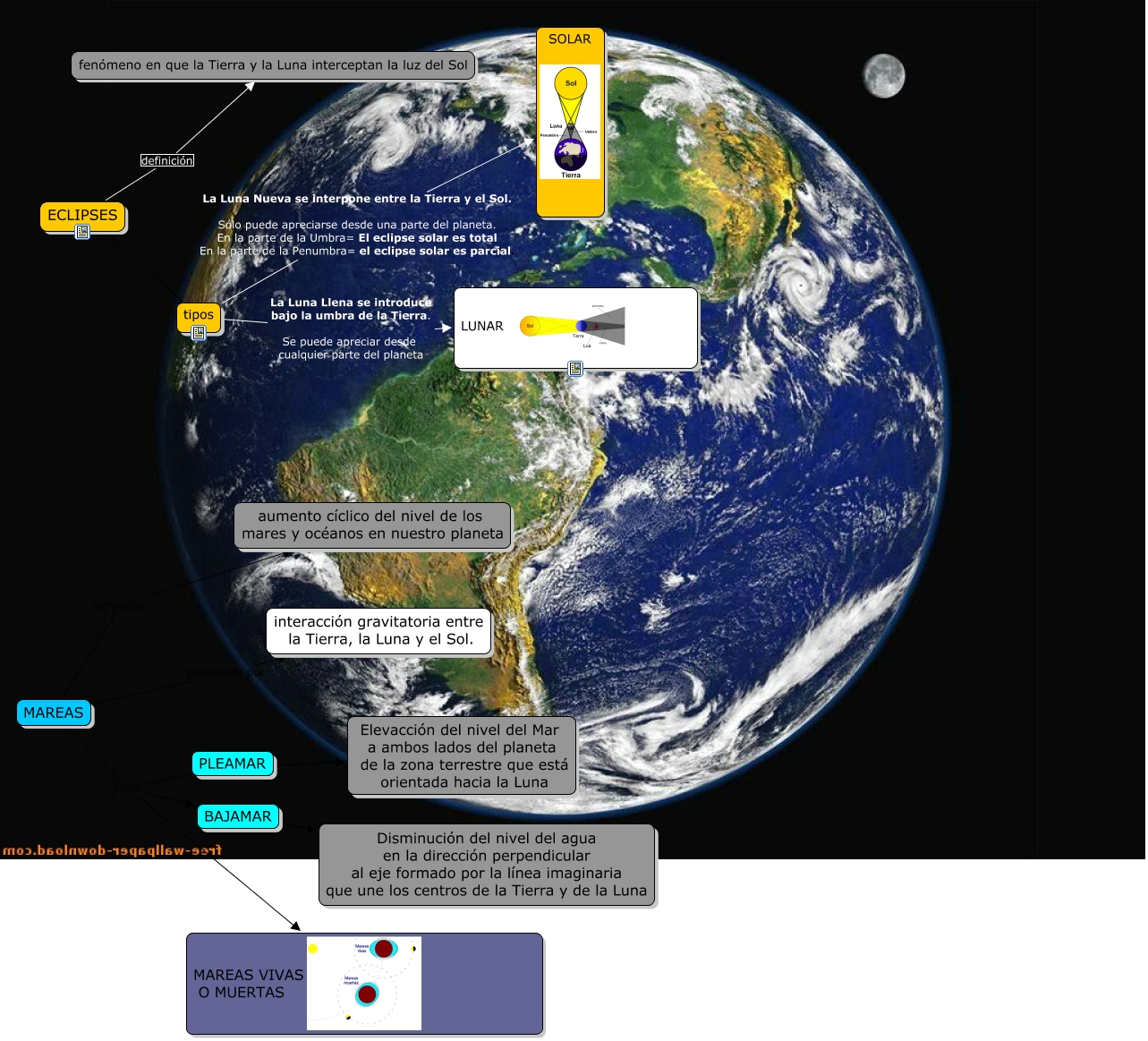 Este Cmap, tiene información relacionada con: eclipses, ECLIPSES ???? tipos, ECLIPSES definición fenómeno en que la Tierra y la Luna interceptan la luz del Sol, MAREAS definición aumento cíclico del nivel de los mares y océanos en nuestro planeta, MAREAS tipos MAREAS VIVAS O MUERTAS, PLEAMAR ???? Elevacción del nivel del Mar a ambos lados del planeta de la zona terrestre que está orientada hacia la Luna, MAREAS tipos BAJAMAR, BAJAMAR ???? Disminución del nivel del agua en la dirección perpendicular al eje formado por la línea imaginaria que une los centros de la Tierra y de la Luna, MAREAS tipos PLEAMAR, ???? La Luna Nueva se interpone entre la Tierra y el Sol. Sólo puede apreciarse desde una parte del planeta. En la parte de la Umbra= El eclipse solar es total En la parte de la Penumbra= el eclipse solar es parcial. SOLAR, MAREAS provocada por interacción gravitatoria entre la Tierra, la Luna y el Sol., ???? La Luna Llena se introduce bajo la umbra de la Tierra. Se puede apreciar desde cualquier parte del planeta LUNAR
