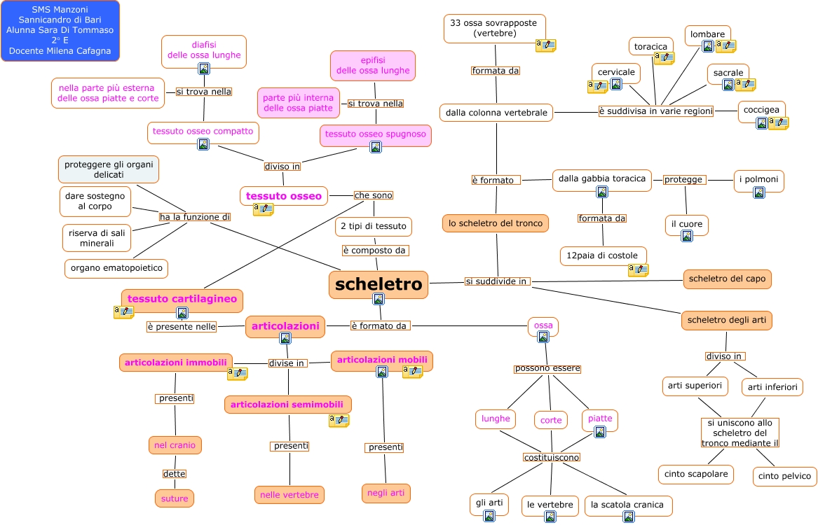 Questa Cmap, creata con IHMC CmapTools, contiene informazioni relative a: l'apparato di sostegno (Sara Di Tommaso), tessuto cartilagineo è presente nelle articolazioni, ossa possono essere corte, tessuto osseo diviso in tessuto osseo spugnoso, scheletro ha la funzione di proteggere gli organi delicati, dalla gabbia toracica protegge il cuore, articolazioni mobili presenti negli arti, lo scheletro del tronco è formato dalla gabbia toracica, dalla colonna vertebrale è suddivisa in varie regioni toracica, scheletro ha la funzione di organo ematopoietico, scheletro degli arti diviso in arti inferiori, scheletro ha la funzione di riserva di sali minerali, tessuto osseo compatto si trova nella diafisi delle ossa lunghe, scheletro si suddivide in lo scheletro del tronco, arti inferiori si uniscono allo scheletro del tronco mediante il cinto scapolare, nel cranio dette suture, tessuto osseo diviso in tessuto osseo compatto, dalla colonna vertebrale formata da 33 ossa sovrapposte (vertebre), ossa possono essere piatte, scheletro è formato da articolazioni, scheletro è composto da 2 tipi di tessuto