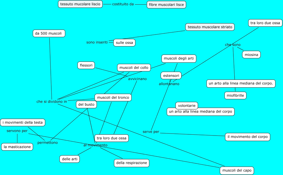 Questa Cmap, creata con IHMC CmapTools, contiene informazioni relative a: Copia di mappa concettuale di monica e marica(apparato muscolatorio), muscoli degli arti serve per il movimento del corpo, flessori avvicinano tra loro due ossa, muscoli del collo permettono i movimenti della testa, muscoli del tronco al movimento delle arti, da 500 muscoli che si dividono in muscoli degli arti, da 500 muscoli che si dividono in muscoli del tronco, tessuto mucolare liscio costituito da fibre muscolari lisce, muscoli del tronco al movimento della respirazione, miofibrille che sono miosina, tessuto muscolare striato sono inseriti sulle ossa, muscoli del tronco al movimento del busto, da 500 muscoli che si dividono in muscoli del capo, da 500 muscoli che si dividono in muscoli del collo, estensori allontanano tra loro due ossa, muscoli del capo servono per la masticazione
