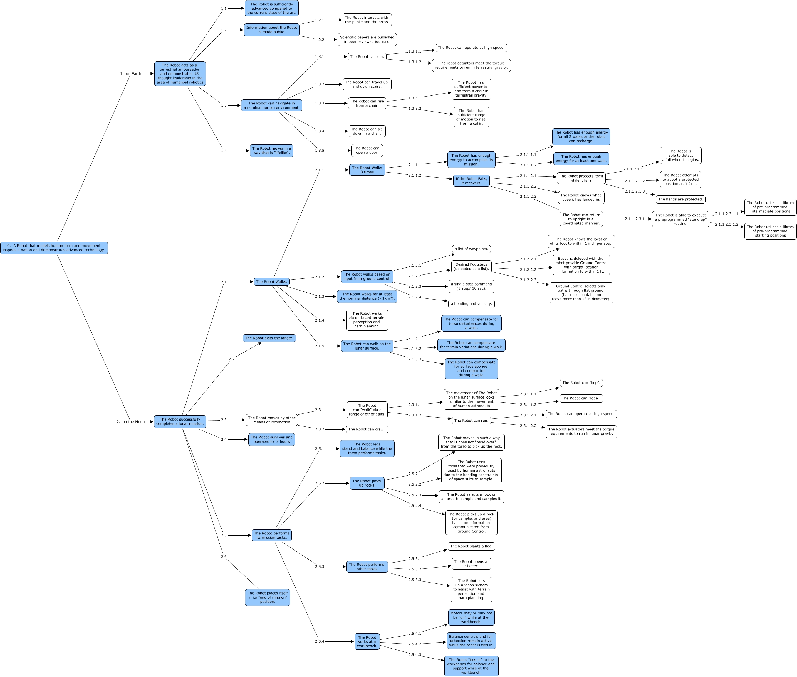 This Concept Map, created with IHMC CmapTools, has information related to: The RobotRequirements, The Robot performs its mission tasks. 2.5.3 The Robot performs other tasks., The Robot Walks. 2.1.3 The Robot walks for at least the nominal distance (əkm?)., The Robot can navigate in a nominal human environment. 1.3.5 The Robot can open a door., The Robot can rise from a chair. 1.3.3.1 The Robot has sufficient power to rise from a chair in terrestrail gravity., Desired Footsteps (uploaded as a list). 2.1.2.2.3 Ground Control selects only paths through flat ground (flat rocks contains no rocks more than 2" in diameter)., Desired Footsteps (uploaded as a list). 2.1.2.2.2 Beacons deloyed with the robot provide Ground Control with target location information to within 1 ft., The Robot successfully completes a lunar mission. 2.2 The Robot exits the lander., The Robot performs other tasks. 2.5.3.2 The Robot opens a shelter, The Robot moves by other means of locomotion 2.3.2 The Robot can crawl., The Robot can run. 1.3.1.1 The Robot can operate at high speed., The Robot performs other tasks. 2.5.3.3 The Robot sets up a Vicon system to assist with terrain perception and path planning., The Robot can run. 2.3.1.2.2 The Robot actuators meet the torque requirements to run in lunar gravity., The Robot has enough energy to accomplish its mission. 2.1.1.1.2 The Robot has enough energy for at least one walk., The Robot walks based on input from ground control: 2.1.2.3 a single step command (1 step/ 10 sec)., The Robot protects itself while it falls. 2.1.1.2.1.2 The Robot attempts to adopt a protected position as it falls., The Robot works at a workbench. 2.5.4.3 The Robot "ties in" to the workbench for balance and support while at the workbench., The Robot has enough energy to accomplish its mission. 2.1.1.1.1 The Robot has enough energy for all 3 walks or the robot can recharge., The Robot picks up rocks. 2.5.2.4 The Robot picks up a rock (or samples and area) based on information communicated from Ground Control., The Robot Walks. 2.1.4 The Robot walks via on-board terrain perception and path planning., The Robot acts as a terrestrial ambassador and demonstrates US thought leadership in the area of humanoid robotics 1.4 The Robot moves in a way that is "lifelike".