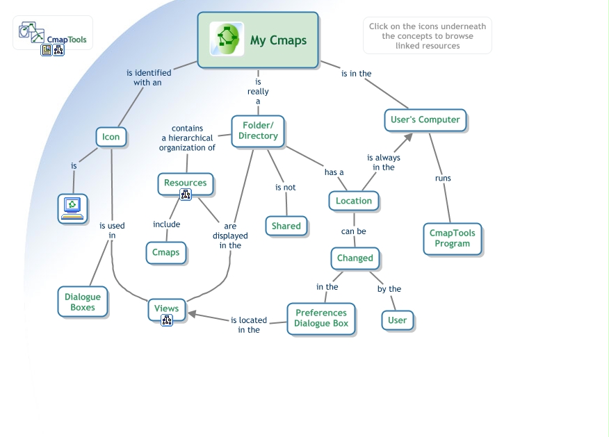 Este Cmap, tiene información relacionada con: CmapTools - My Cmaps, Resources include Cmaps, Preferences Dialogue Box is located in the Views, Icon is used in Dialogue Boxes, Location can be Changed, User's Computer runs CmapTools Program, Changed in the Preferences Dialogue Box, Resources are displayed in the Views, CmapTools My Cmaps is really a Folder/ Directory, CmapTools My Cmaps is in the User's Computer, Folder/ Directory has a Location, Folder/ Directory is not Shared, Changed by the User, Icon is, Folder/ Directory contains a hierarchical organization of Resources, Location is always in the User's Computer, Folder/ Directory are displayed in the Views, Icon is used in Views, CmapTools My Cmaps is identified with an Icon