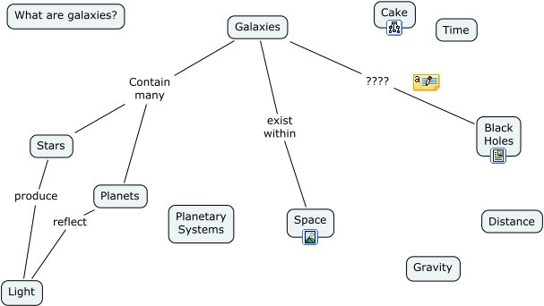 This Concept Map, created with IHMC CmapTools, has information related to: Galaxies, Stars produce Light, Galaxies exist within Space, Planets reflect Light, Galaxies ???? Black Holes, Galaxies Contain many Planets, Galaxies Contain many Stars