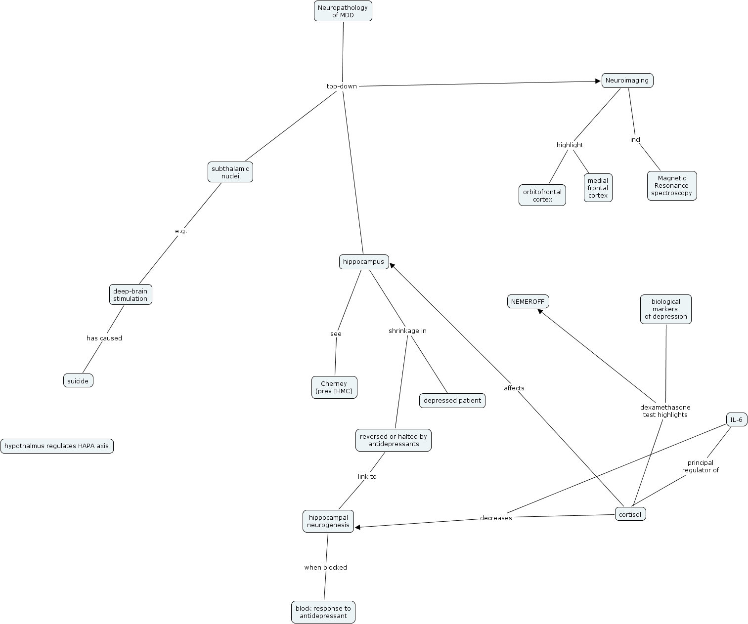 MDD neuropathology, subthalamic nuclei e.g. deep-brain stimulation, reversed or halted by antidepressants link to hippocampal neurogenesis, deep-brain stimulation has caused suicide, cortisol affects hippocampus, Neuropathology of MDD top-down subthalamic nuclei, Neuroimaging highlight orbitofrontal cortex, hippocampus see Cherney (prev IHMC), Neuropathology of MDD top-down hippocampus, cortisol decreases hippocampal neurogenesis, hippocampus shrinkage in reversed or halted by antidepressants
