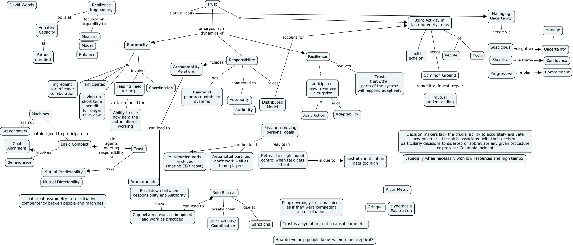 This Concept Map, created with IHMC CmapTools, has information related to: Woods - lkb, Resilience involves Trust that other parts of the systme will respond adaptively, Risk to achieving personal goals can be due to Automated partners don't work well as team players, Risk to achieving personal goals can be due to Automation adds wrokload (marine CBR robot), Adaptive Capacity is future oriented, Accountability Relations can lead to Breakdown between Responsibility and Authority, Role Retreat breaks down Joint Activity/ Coordination, Responsibility has Danger of poor accountability systems, Distributed Model account for Joint Activity in Distributed Systems, Suspicious re gather Uncertainty, Retreat to single agent control when task gets critical is due to cost of coordination gets too high, Trust emerges from dynamics of Reciprocity, Trust is in agents meeting responsibility of Basic Compact, Joint Activity in Distributed Systems of Tech, Trust ???? Mutual Predictability, Reciprocity involves Coordination, Resilience Engineering looks at Adaptive Capacity, Skeptical re frame Confidence, Reciprocity is ingredient for effective collaboration, Reciprocity is giving up short term benefit for longer term gain, anticipated reponsiveness in surprise is of Adaptability