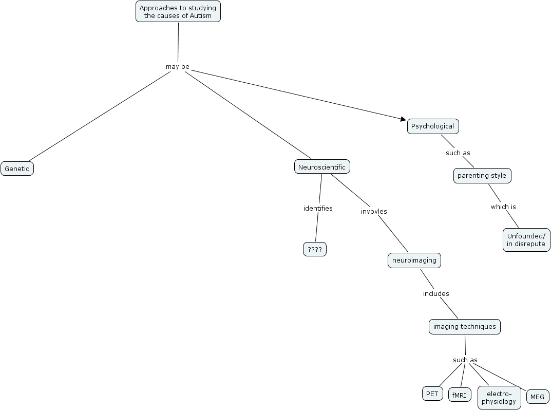 Causation, Neuroscientific invovles neuroimaging, Approaches to studying the causes of Autism may be Neuroscientific, parenting style which is Unfounded/ in disrepute, neuroimaging includes imaging techniques, Approaches to studying the causes of Autism may be Psychological, imaging techniques such as fMRI, imaging techniques such as PET, Neuroscientific identifies ????, Psychological such as parenting style, Approaches to studying the causes of Autism may be Genetic
