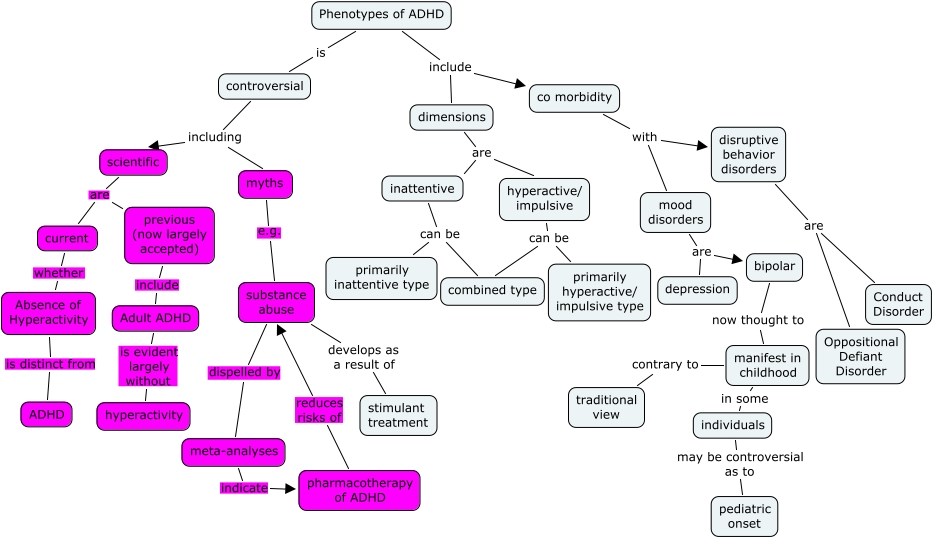 ADHD phenotypes -JDN Rev, Phenotypes of ADHD is controversial, controversial including myths, bipolar now thought to manifest in childhood, controversial including scientific, controversial including scientific, dimensions are hyperactive/ impulsive, current whether Absence of Hyperactivity, inattentive can be combined type, substance abuse dispelled by meta-analyses, pharmacotherapy of ADHD reduces risks of substance abuse