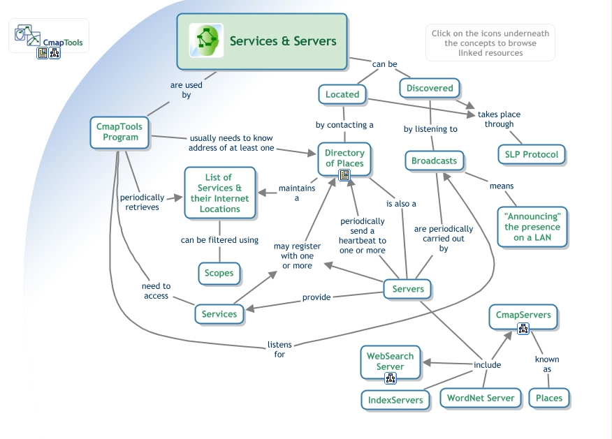 This Concept Map, created with IHMC CmapTools, has information related to: CmapTools - Locating & Discovering Services & Servers, Servers provide Services, List of Services & their Internet Locations can be filtered using Scopes, Servers include WordNet Server, Broadcasts are periodically carried out by Servers, Directory of Places is also a Servers, CmapTools Program need to access Services, Services may register with one or more Directory of Places, CmapTools Services and Servers can be Located, Broadcasts means "Announcing" the presence on a LAN, Located takes place through SLP Protocol, CmapTools Services and Servers can be Discovered, Located by contacting a Directory of Places, Servers include IndexServers, Discovered by listening to Broadcasts, CmapTools Program periodically retrieves List of Services & their Internet Locations, CmapTools Services and Servers are used by CmapTools Program, Servers include CmapServers, CmapTools Program usually needs to know address of at least one Directory of Places, Directory of Places maintains a List of Services & their Internet Locations, Servers include WebSearch Server