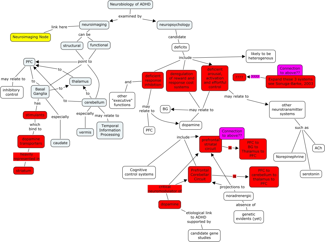ADHD Neurobiology, dopamine critical neuromodulator of prefrontal striatal circuit, cerebellum to PFC, functional point to PFC, dopamine etiological link to ADHD supported by candidate gene studies, functional point to PFC, neuroimaging can be structural, Basal Ganglia to thalamus, deficient response inhibition may relate to dopamine, deregulation of reward and response cost systems may relate to dopamine, Basal Ganglia especially caudate