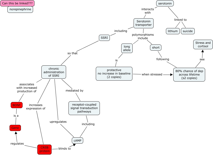 MDD serotonin - JDN-Rev, BDNF is a Gene, CREB protein blinds to cAMP, CREB protein regulates Gene, chronic administration of SSRI increases expression of CREB protein, serotonin linked to suicide, receptot-coupled signal transduction pathways including cAMP, long allele is protective no increase in baseline (2 copies), serotonin interacts with Serotonin transporter, 80% chance of dep across lifetime (s2 copies) see Stress and cortisol, short following 80% chance of dep across lifetime (s2 copies)