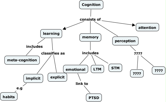 learning classifies as implicit,learning classifies as explicit,memory includes emotional,perception ???? ????,emotional link to PTSD,Cognition consists of perception,Cognition consists of attention,Cognition consists of memory,Cognition consists of learning,implicit e.g habits,memory includes STM,memory includes LTM,learning includes meta-cognition,perception ???? ????