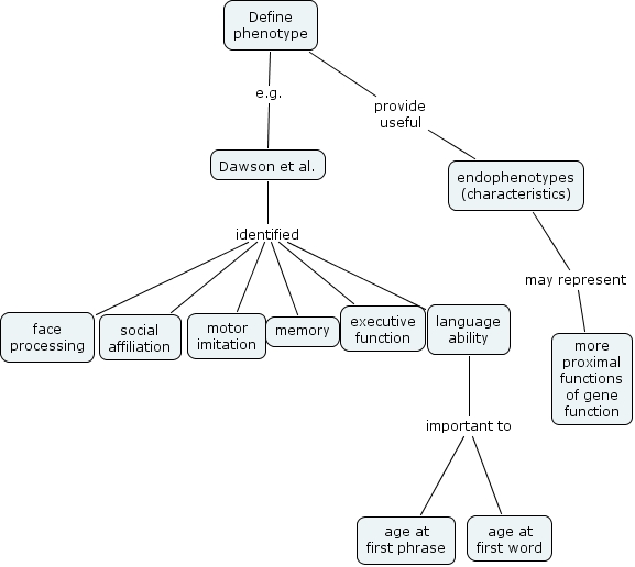 Autism Phenotypes, language ability important to age at first phrase, endophenotypes (characteristics) may represent more proximal functions of gene function, Dawson et al. identified language ability, Define phenotype e.g. Dawson et al., Dawson et al. identified social affiliation, Dawson et al. identified face processing, Define phenotype provide useful endophenotypes (characteristics), language ability important to age at first word, Dawson et al. identified memory, Dawson et al. identified executive function