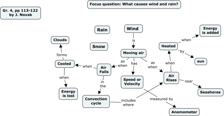 Wind and rain, pp 113-122, Air Falls when Cooled, Heated by sun, Convection cycle includes where Air Rises, Moving air as when Air Rises, Cooled when Energy is lost, Air Rises when Heated, Cooled forms Clouds, Heated when Energy is added, Speed or Velocity measured by Anemometer, Moving air has Speed or Velocity