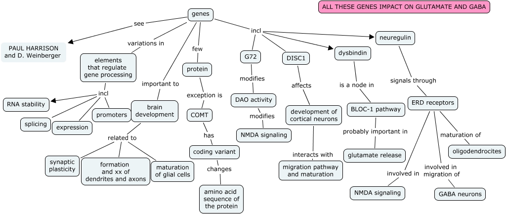 SZ genes2 - JDN Rev, BLOC-1 pathway probably important in glutamate release, DISC1 affects development of cortical neurons, G72 modifies DAO activity, brain development related to maturation of glial cells, genes incl DISC1, genes incl G72, dysbindin is a node in BLOC-1 pathway, development of cortical neurons interacts with migration pathway and maturation, COMT has coding variant, elements that regulate gene processing incl splicing