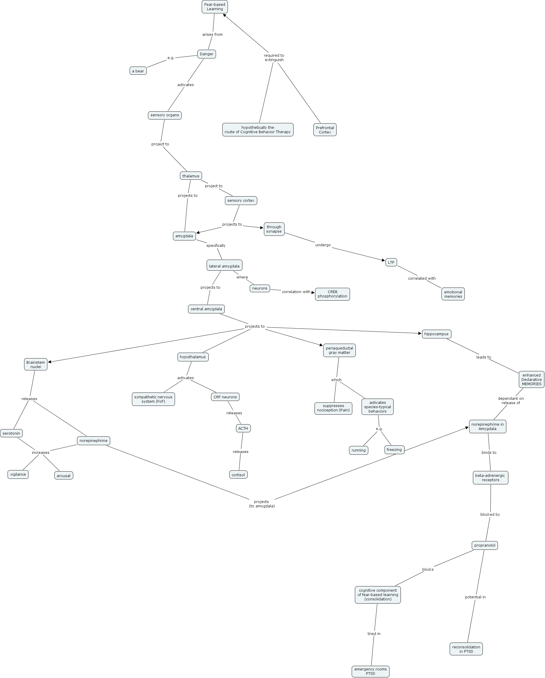 SH Fear based learning, central amygdala projects to hippocampus, beta-adrenergic receptors blocked by propranolol, Brainstem nuclei releases norepinephrine, Prefrontal Cortex required to extinguish hypothetically the route of Cognitive Behavior Therapy, Brainstem nuclei releases serotonin, amygdala specifically lateral amygdala, activates species-typical behaviors e.g. freezing, lateral amygdala where neurons, enhanced Declarative MEMORIES dependant on release of norepinephrine in Amygdala, activates species-typical behaviors e.g. running
