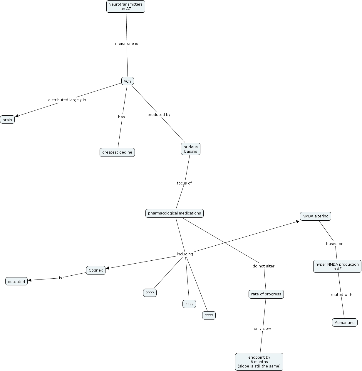 AZ neurotransmitters, Neurotransmitters an AZ major one is ACh, ACh has greatest decline, ACh distributed largely in brain, pharmacological medications do not alter rate of progress, pharmacological medications including NMDA altering, Cognex is outdated, pharmacological medications including Cognex, rate of progress only slow endpoint by 6 months (slope is still the same), nucleus basalis focus of pharmacological medications, ACh produced by nucleus basalis