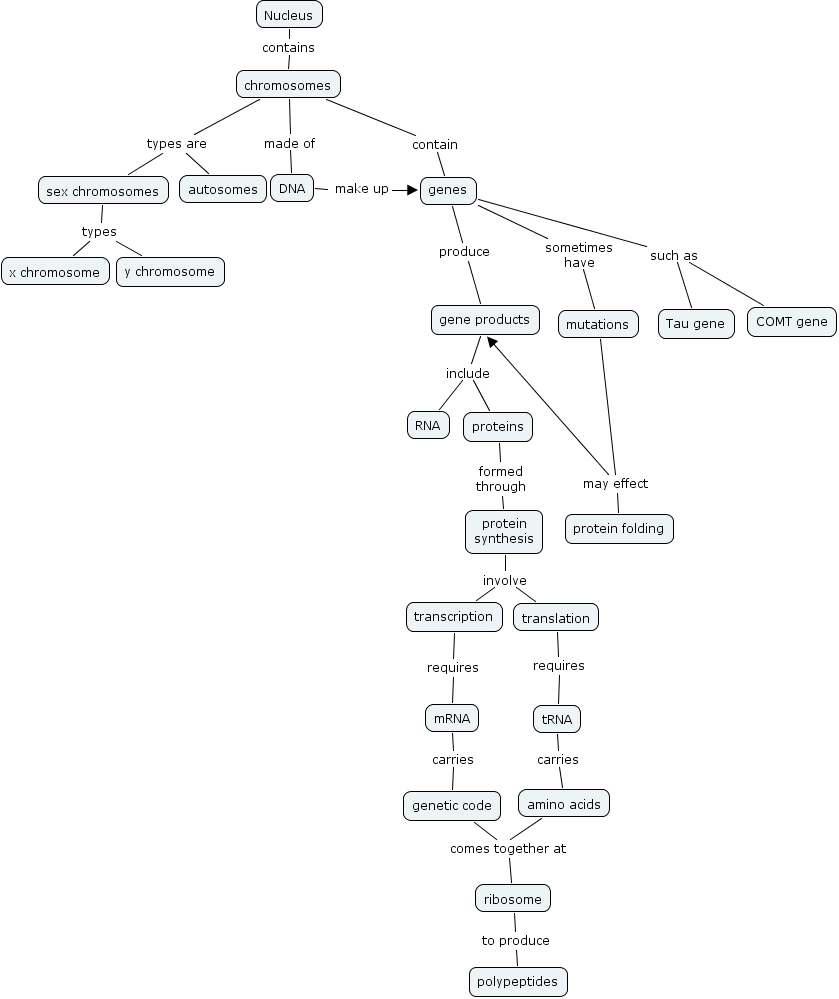 What's is a gene, translation requires tRNA, gene products include RNA, protein synthesis involve transcription, genes produce gene products, mRNA carries genetic code, genes such as COMT gene, mutations may effect protein folding, chromosomes contain genes, Nucleus contains chromosomes, chromosomes made of DNA