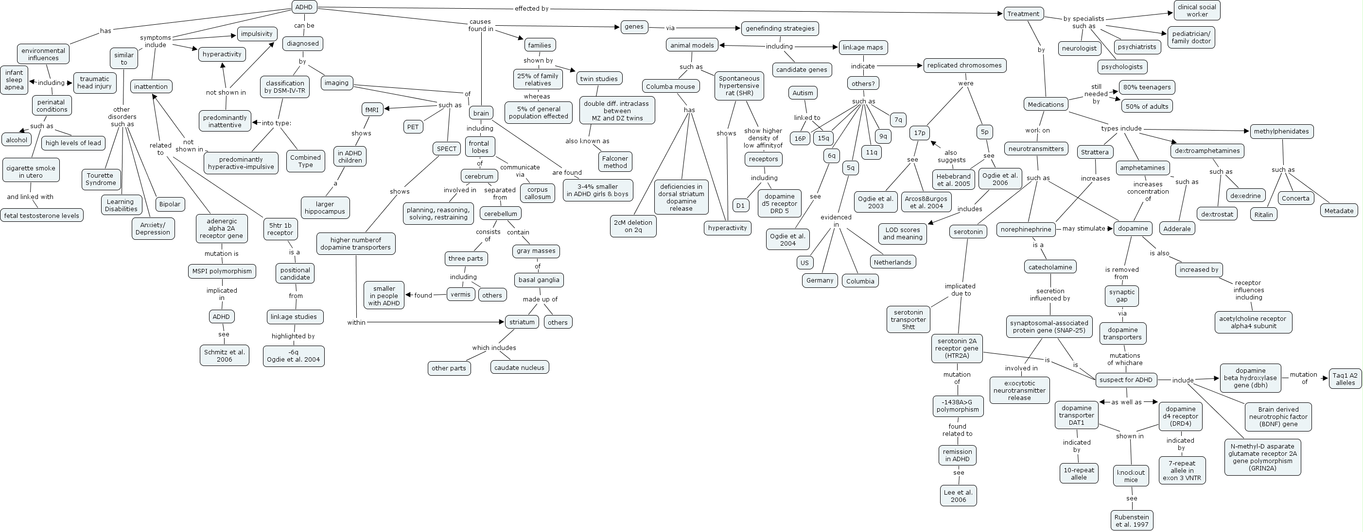 ADHD (Attention Deficit Hyperactive Disorder), 17p see Ogdie et al. 2003, neurotransmitters such as dopamine, cerebellum consists of three parts, dopamine transporter DAT1 indicated by 10-repeat allele, 5p see Hebebrand et al. 2005, receptors including D1, norephinephrine may stimulate dopamine, three parts including others, ADHD symptoms include impulsivity, 17p see Arcos&Burgos et al. 2004