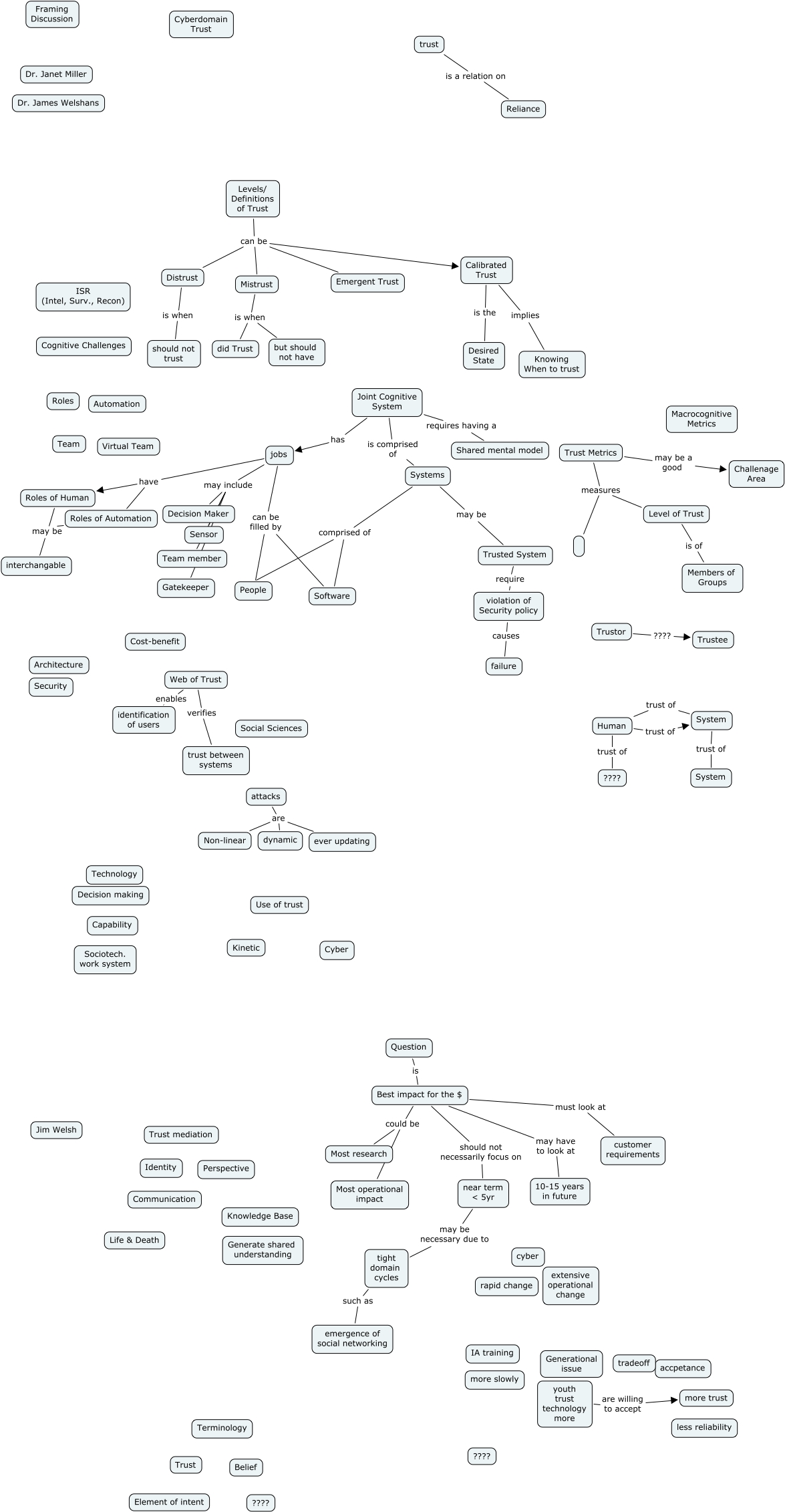 This Concept Map, created with IHMC CmapTools, has information related to: Framing Discussion, Joint Cognitive System has jobs, Roles of Human may be interchangable, Web of Trust enables identification of users, Best impact for the $ could be Most operational impact, Level of Trust is of Members of Groups, near term < 5yr may be necessary due to tight domain cycles, jobs can be filled by Software, Trustor ???? Trustee, Systems comprised of Software, jobs can be filled by People, attacks are ever updating, Levels/ Definitions of Trust can be Emergent Trust, Joint Cognitive System requires having a Shared mental model, jobs may include Decision Maker, Trust Metrics may be a good Challenage Area, Levels/ Definitions of Trust can be Calibrated Trust, violation of Security policy causes failure, Best impact for the $ should not necessarily focus on near term < 5yr, Levels/ Definitions of Trust can be Distrust, Question is Best impact for the $