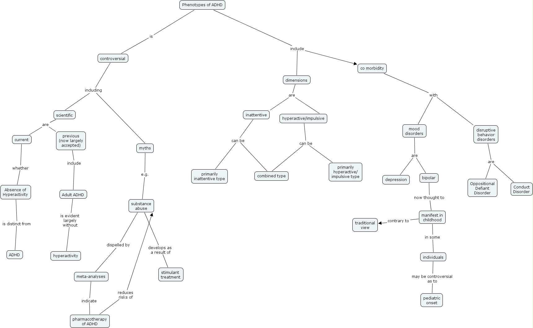 ADHD phenotypes, Phenotypes of ADHD is controversial, bipolar now thought to manifest in childhood, controversial including myths, controversial including scientific, controversial including scientific, dimensions are hyperactive/impulsive, inattentive can be combined type, current whether Absence of Hyperactivity, pharmacotherapy of ADHD reduces risks of substance abuse, substance abuse dispelled by meta-analyses