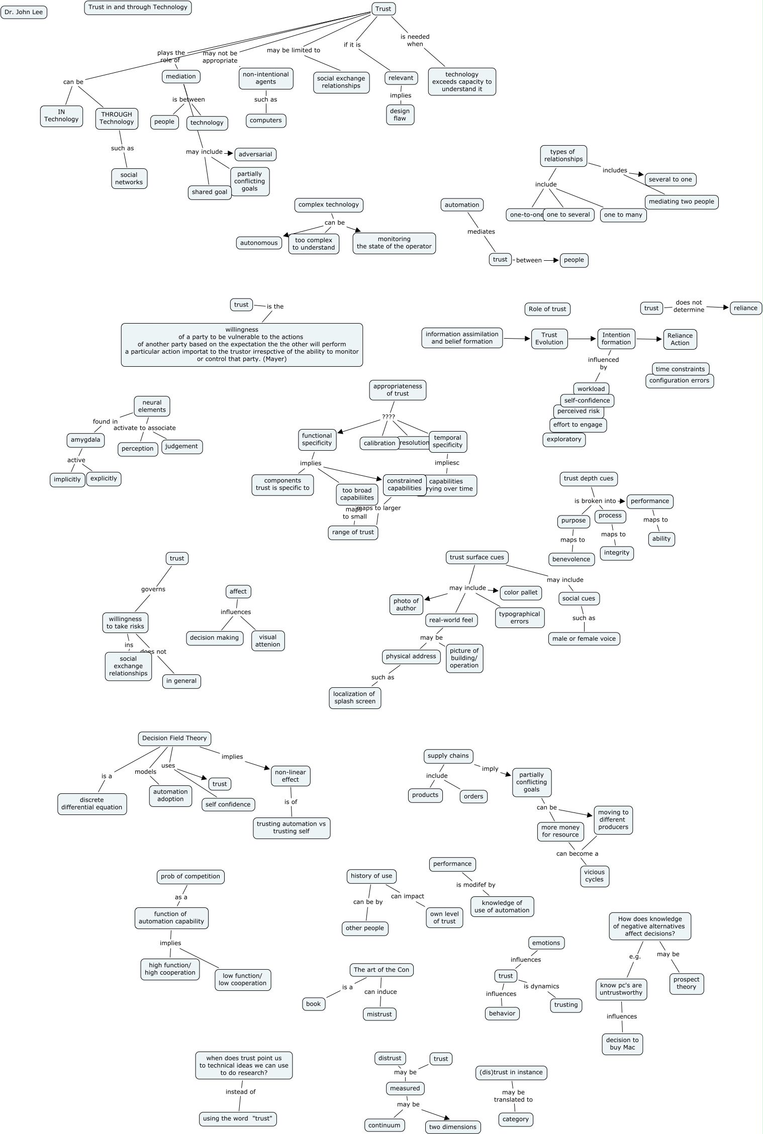 This Concept Map, created with IHMC CmapTools, has information related to: Lee - TCE, mediation may include shared goal, real-world feel may be picture of building/ operation, trust surface cues may include social cues, trust depth cues is broken into purpose, trust may be measured, Decision Field Theory is a discrete differential equation, willingness to take risks ins social exchange relationships, THROUGH Technology such as social networks, neural elements activate to associate judgement, affect influences visual attenion, partially conflicting goals can be moving to different producers, prob of competition as a function of automation capability, appropriateness of trust ???? functional specificity, mediation may include partially conflicting goals, history of use can impact own level of trust, amygdala active implicitly, temporal specificity impliesc capabilities varying over time, appropriateness of trust ???? calibration, functional specificity implies constrained capabilities, Trust is needed when technology exceeds capacity to understand it