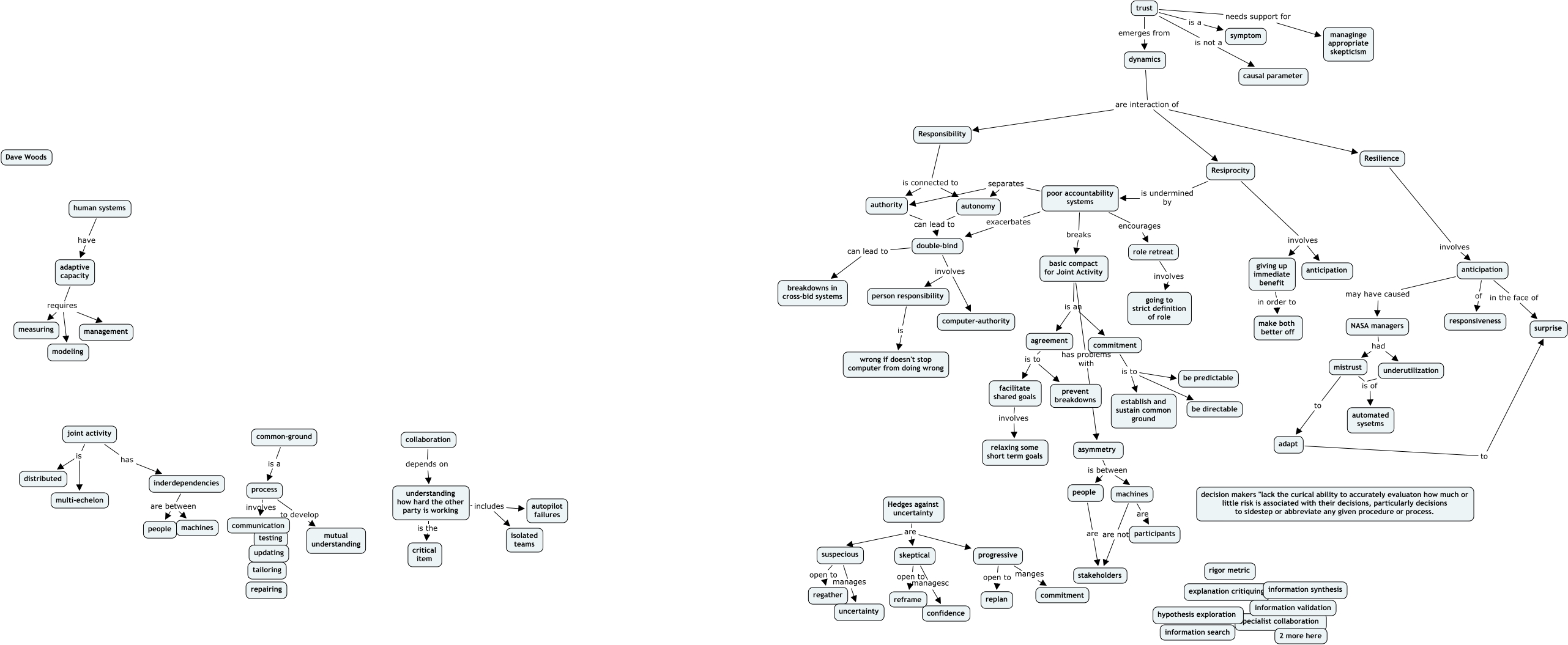 This Concept Map, created with IHMC CmapTools, has information related to: Woods - TCE, adaptive capacity requires modeling, inderdependencies are between machines, progressive manges commitment, poor accountability systems separates authority, machines are not stakeholders, autonomy can lead to double-bind, asymmetry is between machines, Hedges against uncertainty are suspecious, joint activity is multi-echelon, human systems have adaptive capacity, double-bind involves person responsibility, joint activity is distributed, underutilization is of automated sysetms, agreement is to facilitate shared goals, commitment is to be directable, mistrust to adapt, trust emerges from dynamics, adaptive capacity requires management, common-ground is a process, commitment is to be predictable