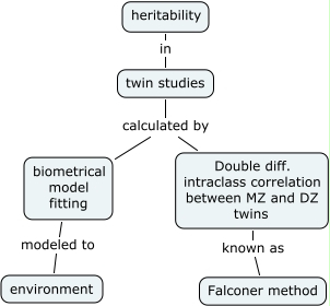 ADHD Calculating Heritability - JDN Rev, Double diff. intraclass correlation between MZ and DZ twins known as Falconer method, heritability in twin studies, twin studies calculated by biometrical model fitting, twin studies calculated by Double diff. intraclass correlation between MZ and DZ twins, biometrical model fitting modeled to environment