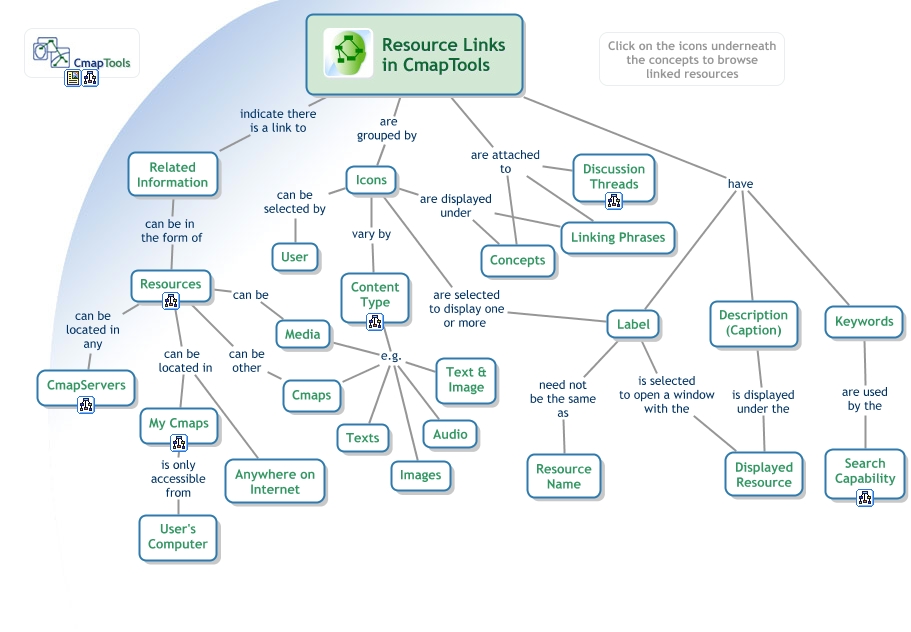 This Concept Map, created with IHMC CmapTools, has information related to: CmapTools - Resource Links, Icons can be selected by User, Resources can be located in any CmapServers, Description (Caption) is displayed under the Displayed Resource, Content Type e.g. Audio, Content Type e.g. Cmaps, Icons vary by Content Type, Label is selected to open a window with the Displayed Resource, My Cmaps is only accessible from User's Computer, Content Type e.g. Text & Image, Media e.g. Images, Label need not be the same as Resource Name, Media e.g. Texts, Media e.g. Cmaps, Resource Links in CmapTools are attached to Concepts, Resource Links in CmapTools have Label, Related Information can be in the form of Resources, Resource Links in CmapTools are attached to Discussion Threads, Resource Links in CmapTools are attached to Linking Phrases, Resources can be other Cmaps, Media e.g. Text & Image