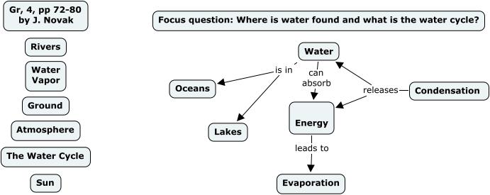 Water and water cycle, pp 72-80 Skeleton + concepts, Water is in Oceans, Water is in Lakes, Condensation releases Energy, Energy leads to Evaporation, Water can absorb Energy, Condensation releases Energy, Water can absorb Energy, Energy leads to Evaporation, Condensation releases Water, Water is in Lakes